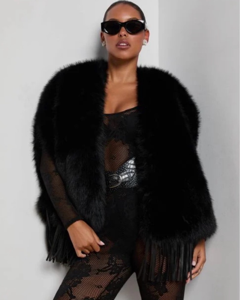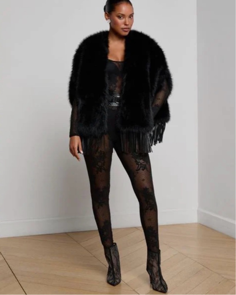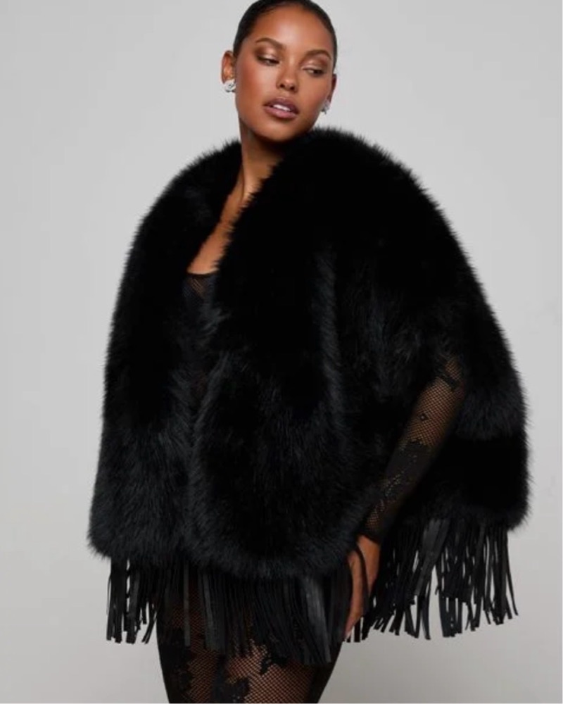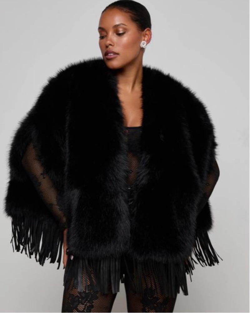 Sooo chic and flattering! Faux fur with genuine leather trim, has holes for arms, Lined, No closures. L'AGENCE Nathalia Faux Fur Cape In Black Color: black