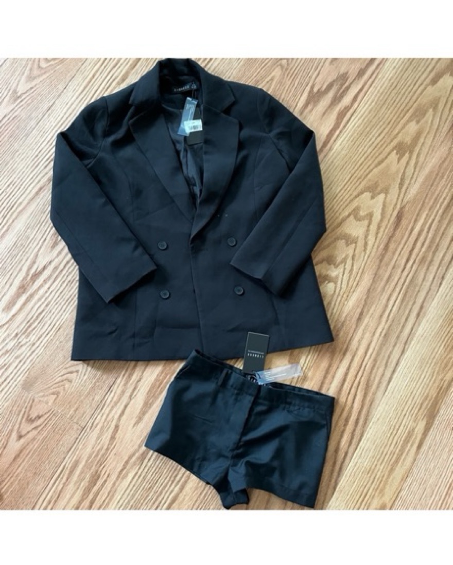The shorts have a broken belt loop and the blazer has two marks on the front