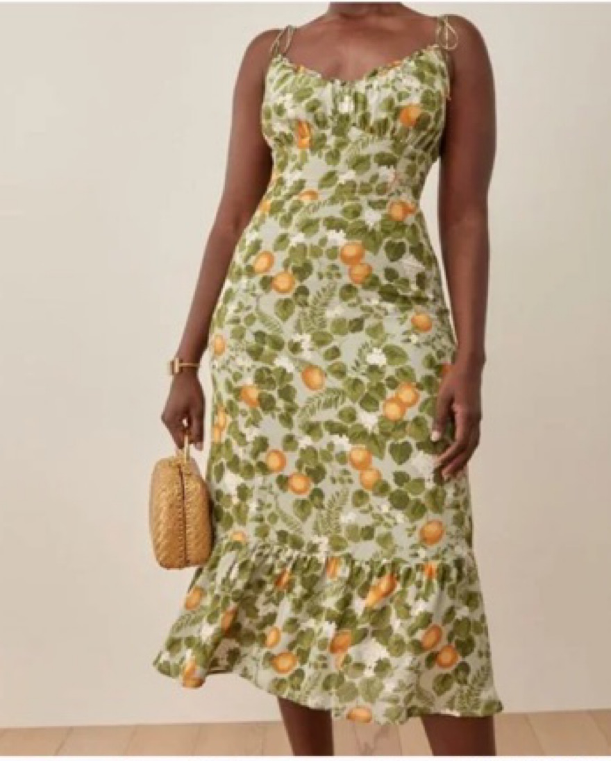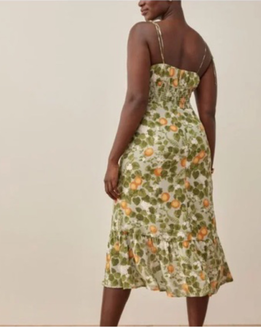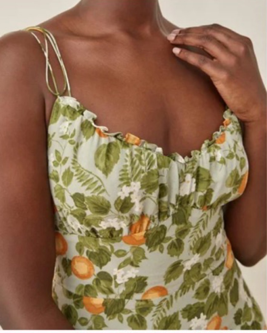 The Embry is slim fitting in the bodice with a relaxed fitting skirt. It features a ruffle edged neckline and tie straps, plus ruching at the bust for a slightly fancier look.