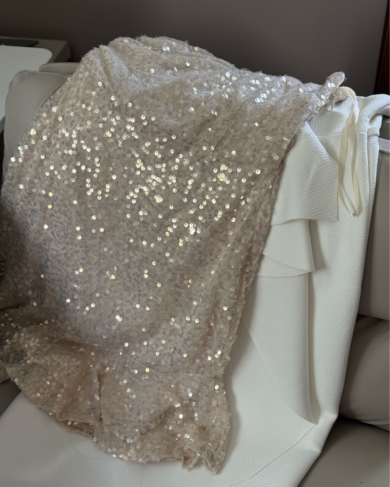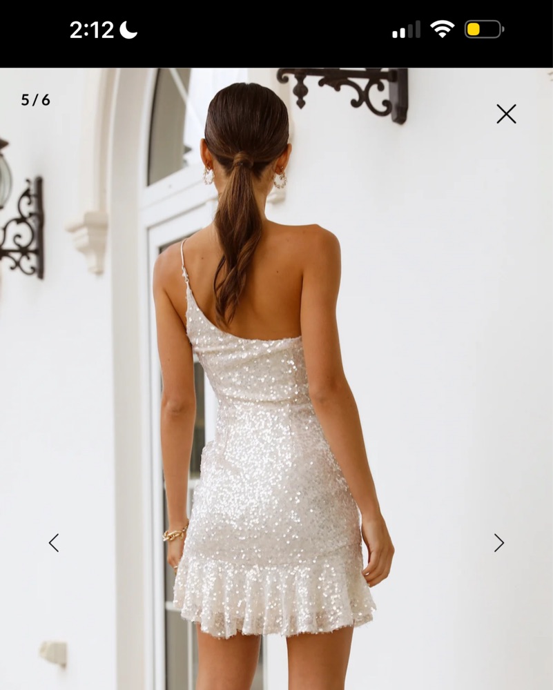Wore this as a after party dress for my wedding a few years ago! Size medium from hello molly. One shoulder is adjustable. It IS more of a cream than a white, last pic shows for reference!