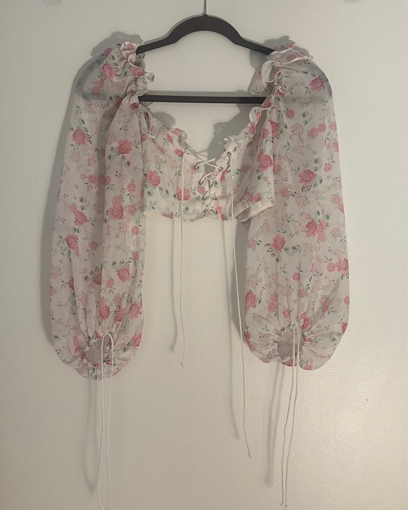For love and lemons pink and white floral puff sleeve top. Laces up in the front and has ties on the sleeves. Super light and airy!