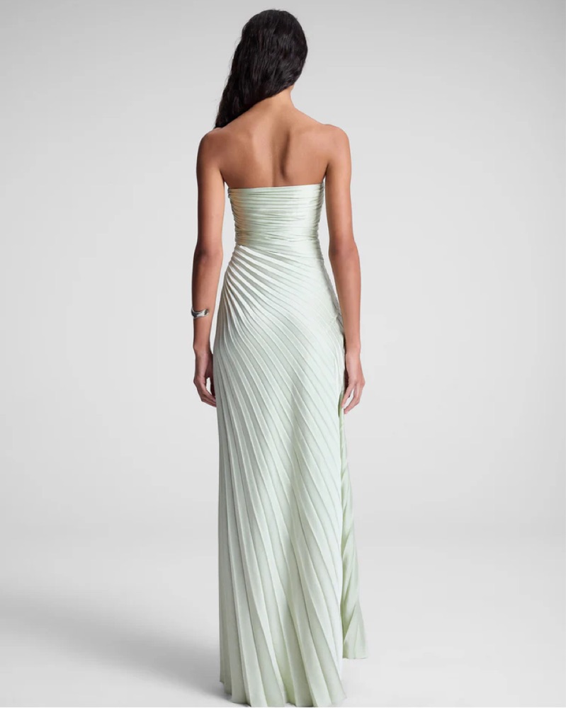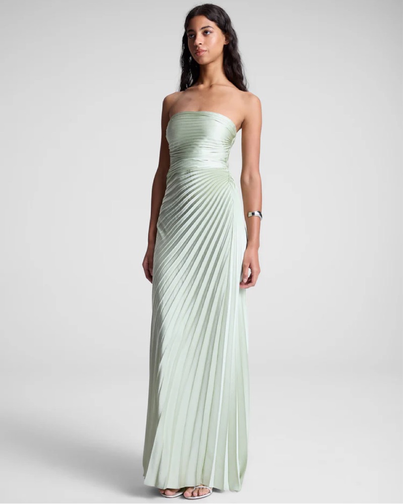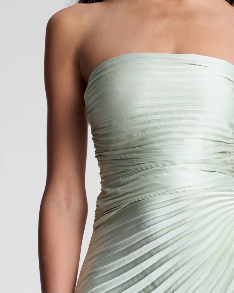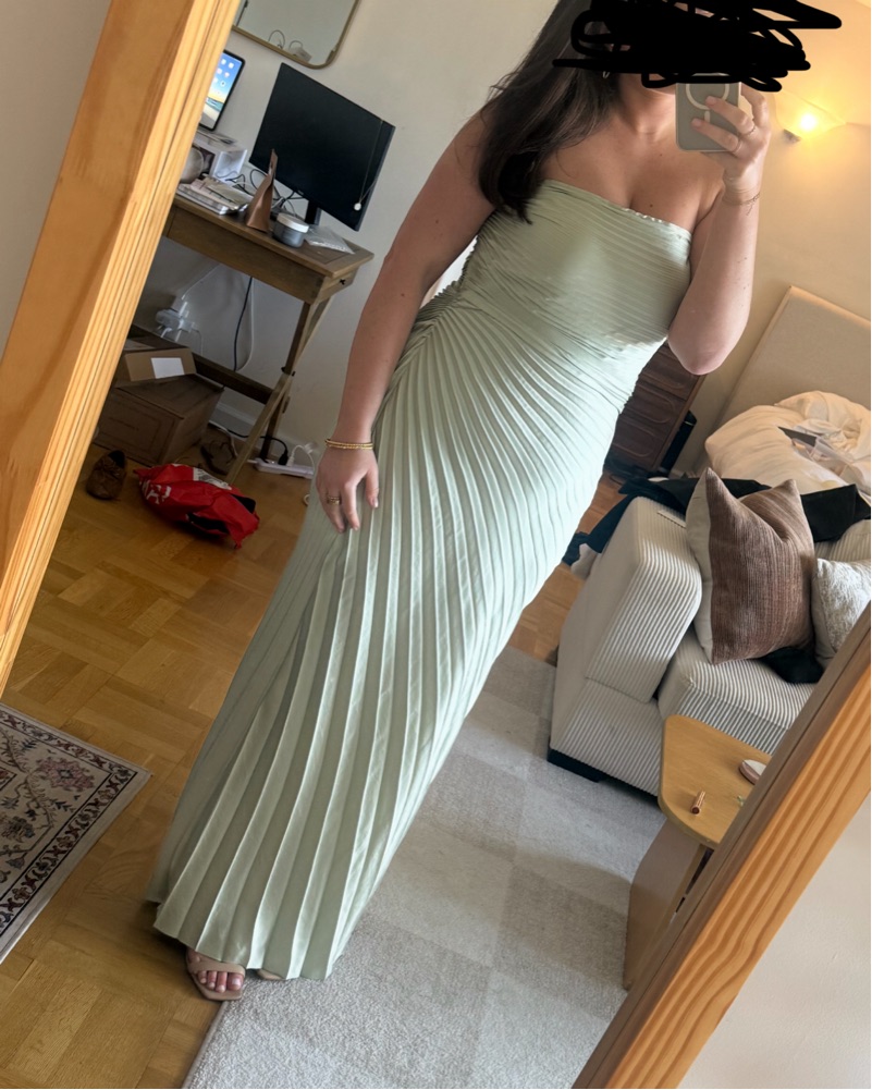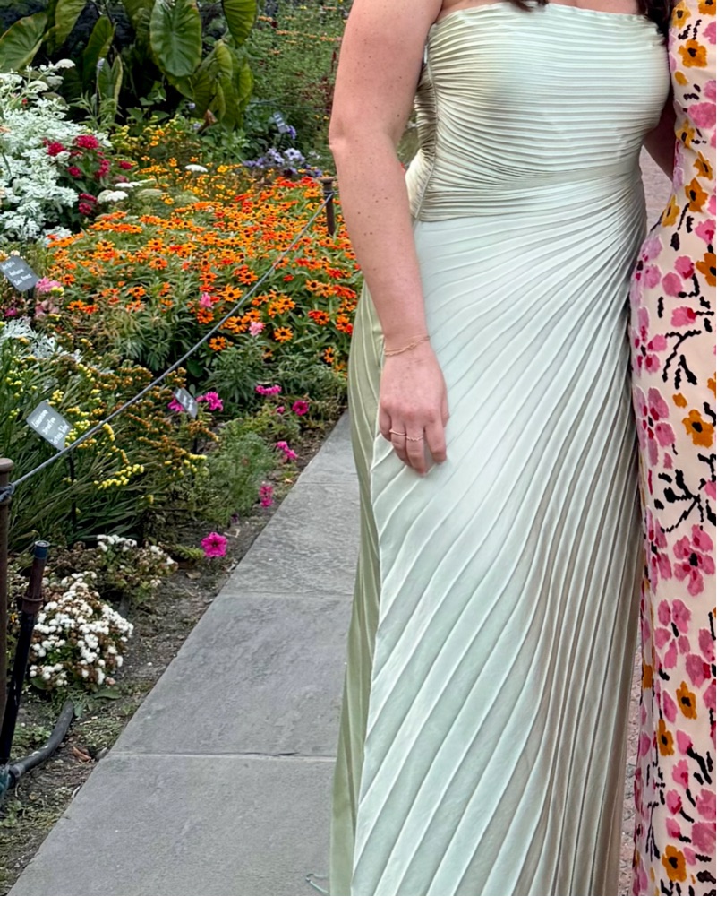 This stunning pleated maxi dress in a soft spearmint is perfect for a formal event or special occasion. The fitted bodice and flowing skirt create a flattering, feminine silhouette. 100% Polyester, Corset Lining: 87% Polyester 13% Elastane. Partially Lined. runs small.