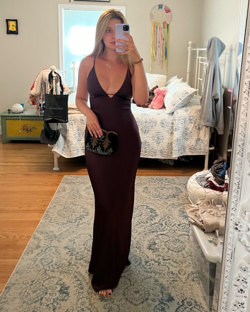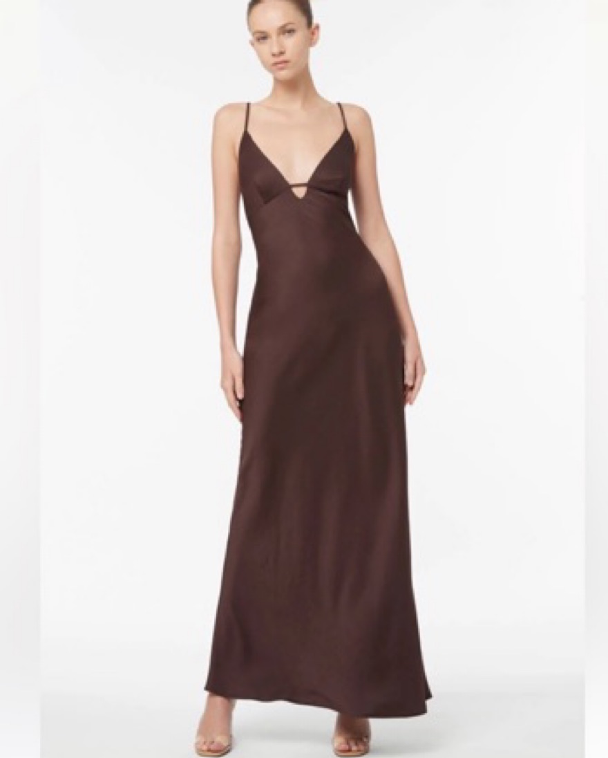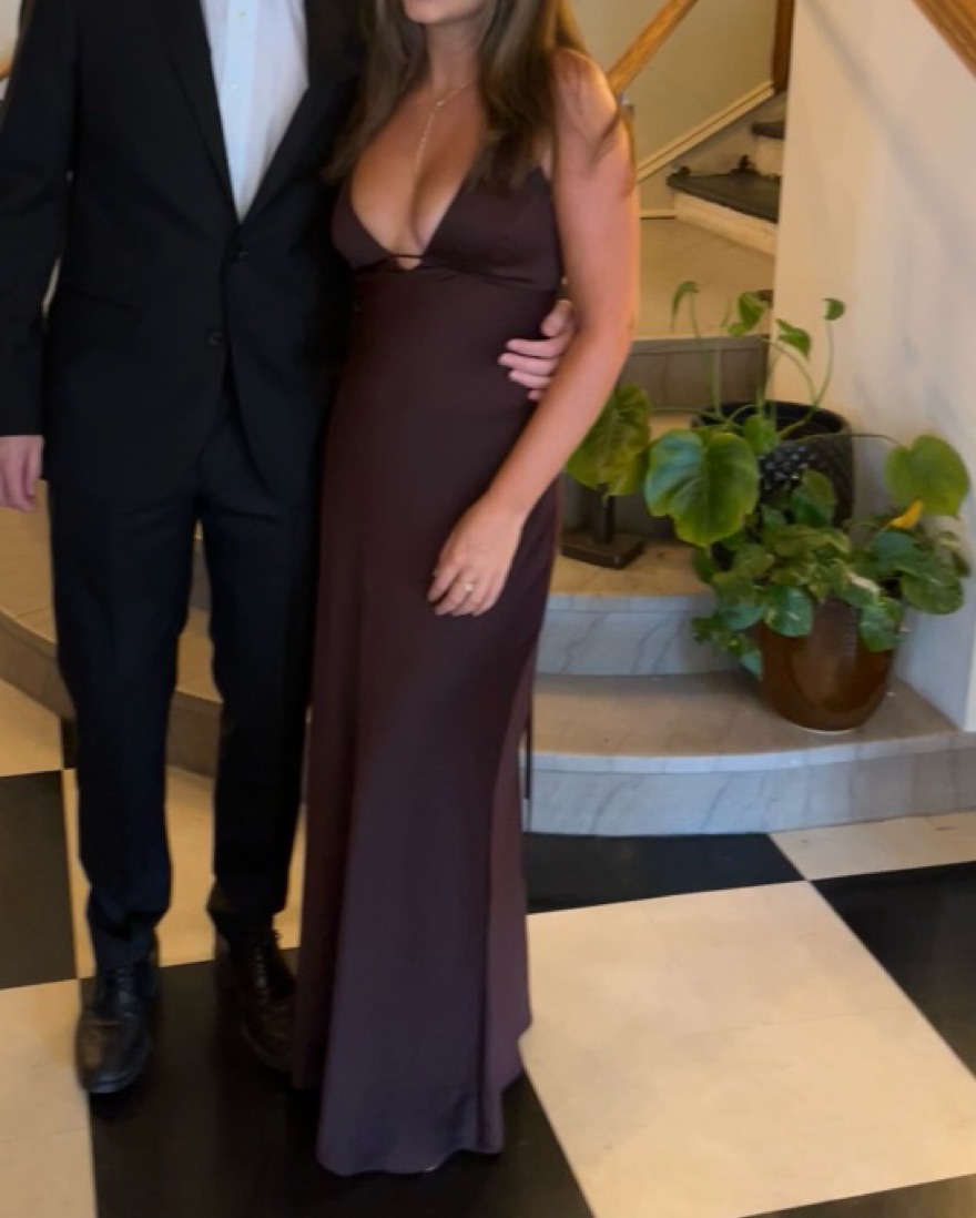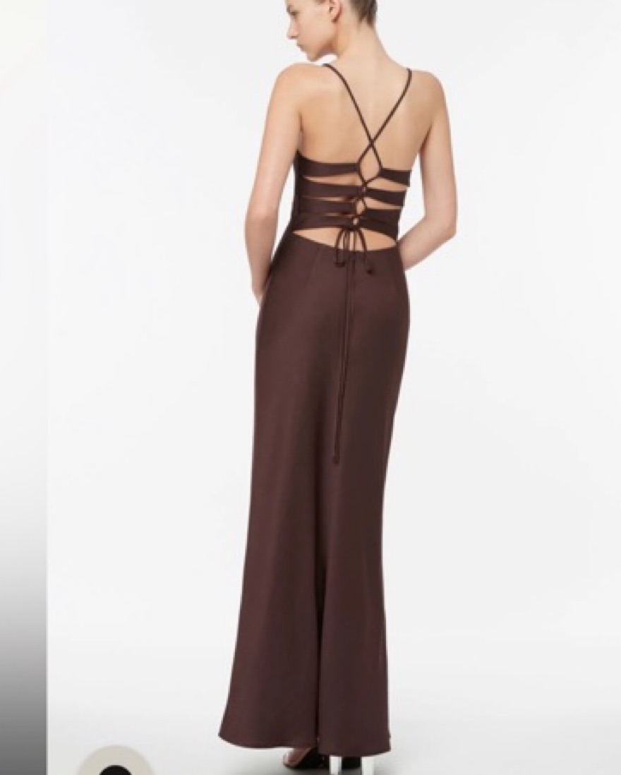 Truffle Brown with purple undertones. Tie back details. Flattering halter style.