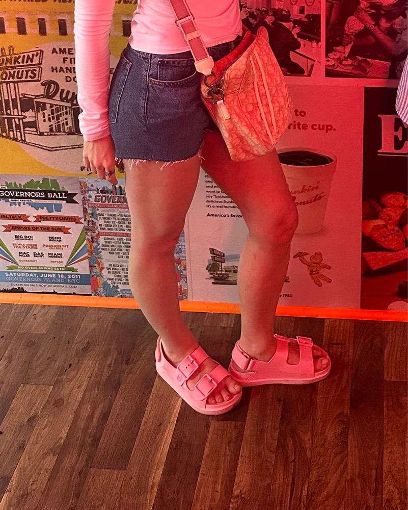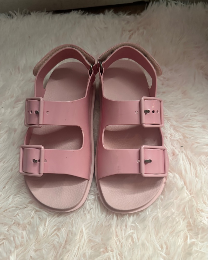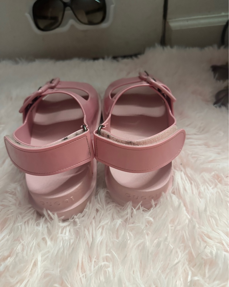 pink rubber sandals with GG detail and velcro strap in back, size 35