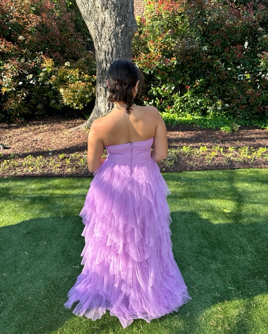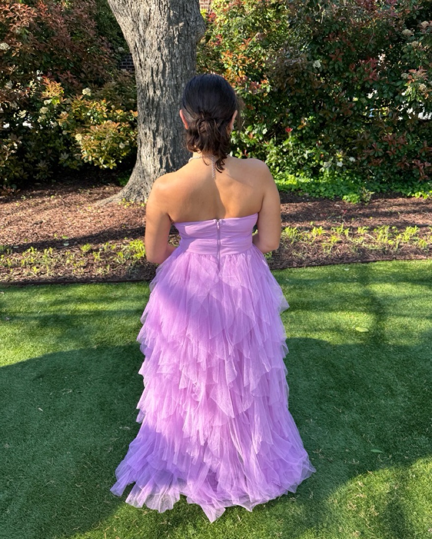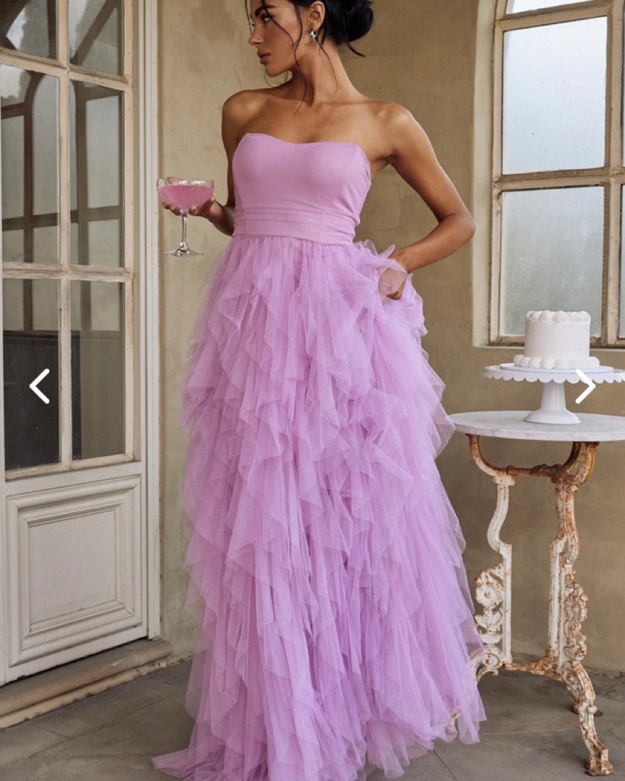Selfie Leslie Rori Tulle Cascade Maxi Dress! Size medium and VERY long! I’m 5’1 and it was super long on me. (I did not get alterations for this dress). Strapless in an orchid pink purple color and is so beautiful.