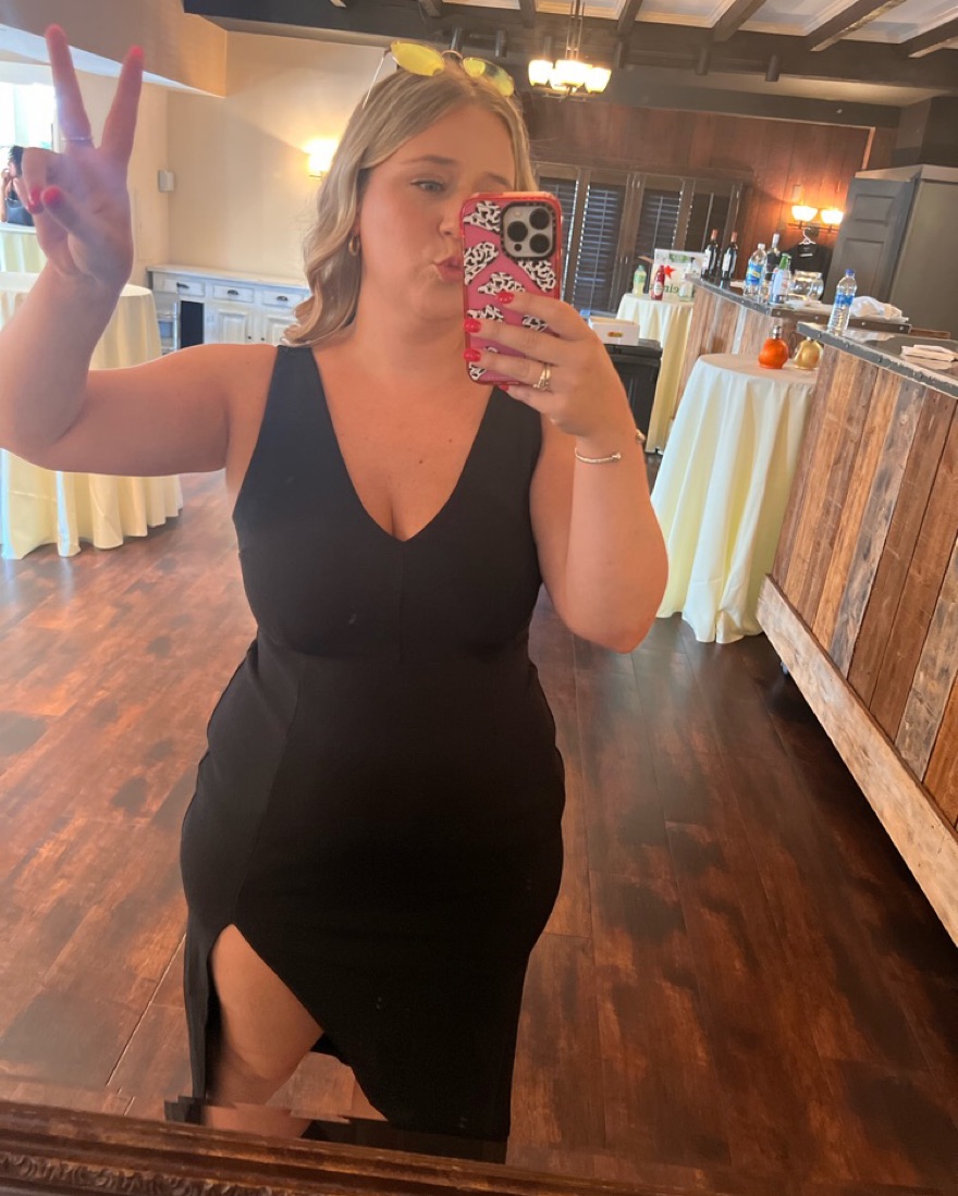 Midi length, very comfy and flattering, great for any seaskn or wedding. Has slit and is true midi length