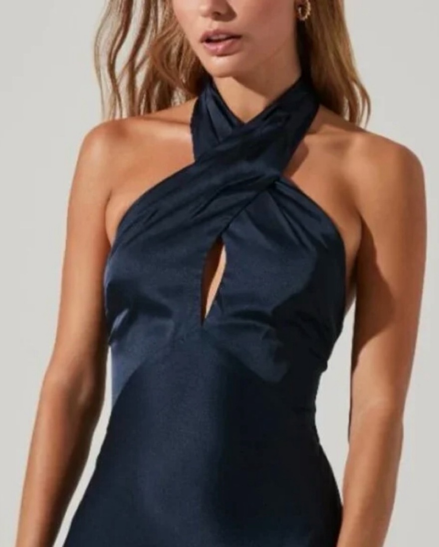 Navy blue cross front halter neck midi dress. Clearer photos of the shape/design are posted in a black version of this dress.