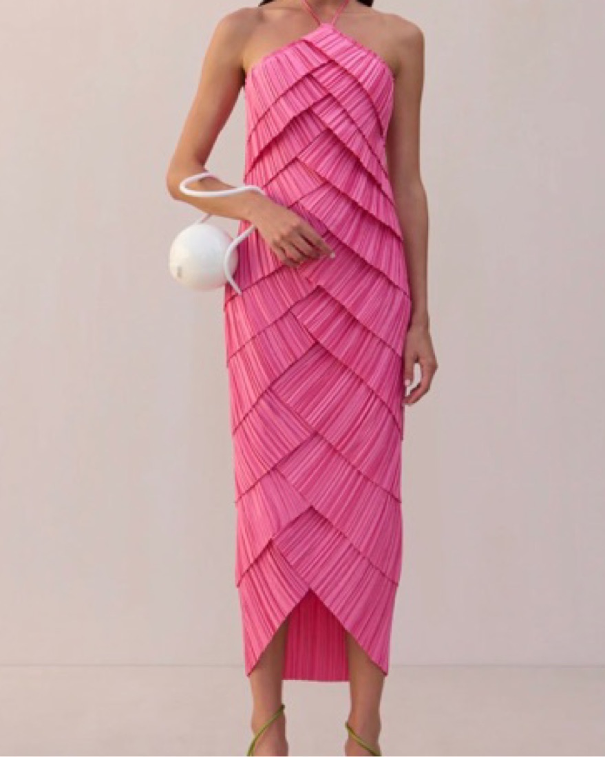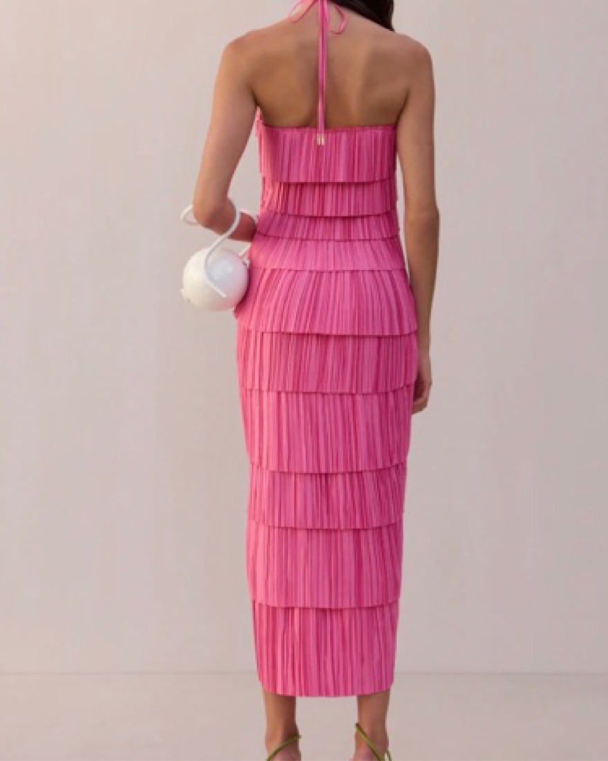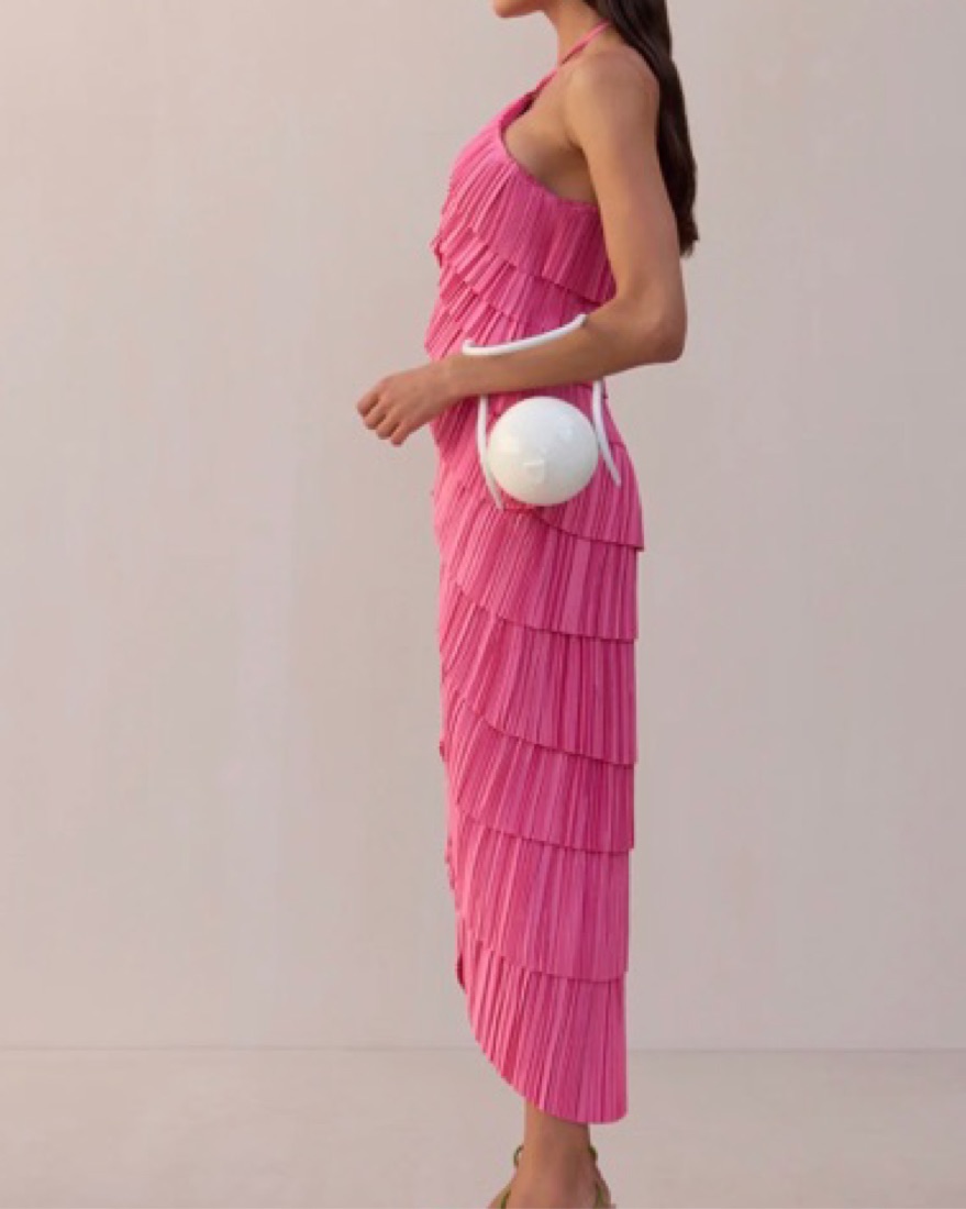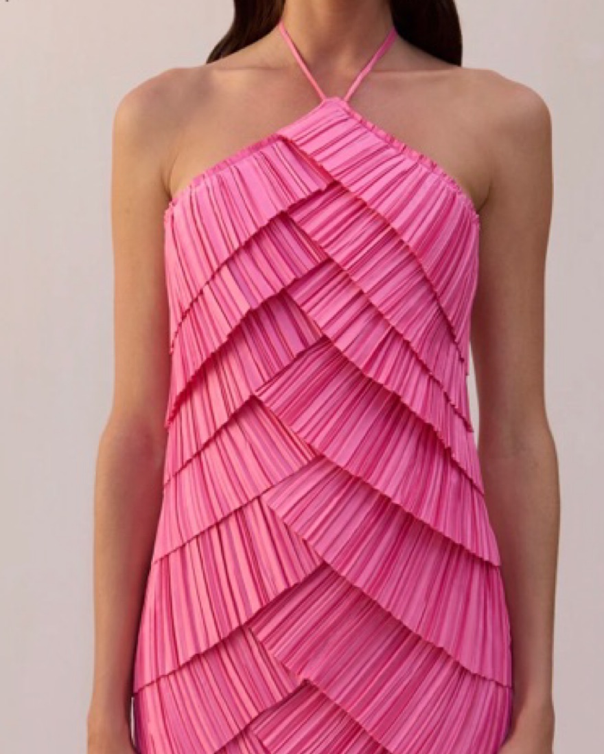 A sleeveless, halter neck dress made in our signature plissé with a layered design.
