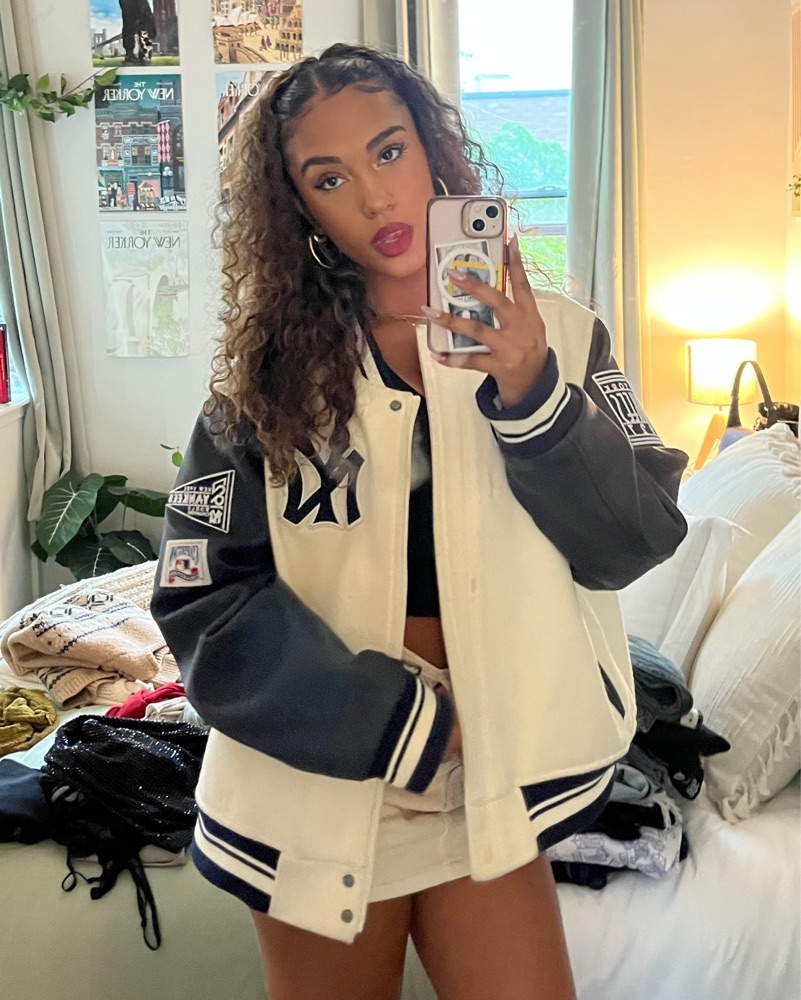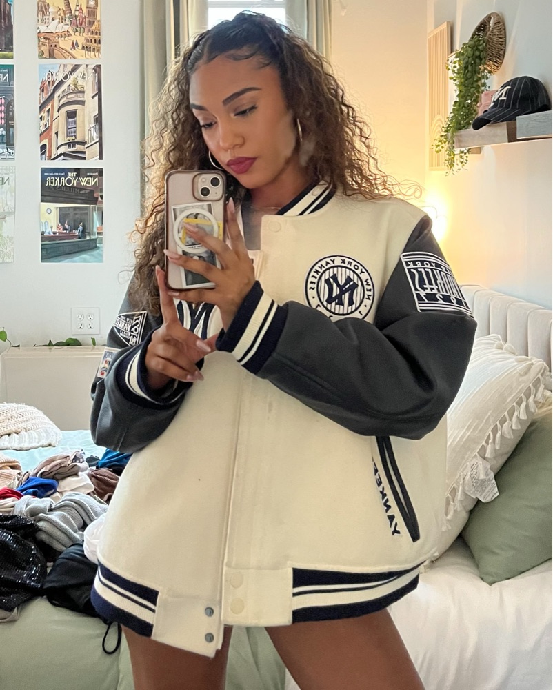 Step into classic streetwear with this oversized black-and-white Yankees varsity jacket. It’s the perfect blend of sporty and chic, slightly baggy with bold embroidered patches.