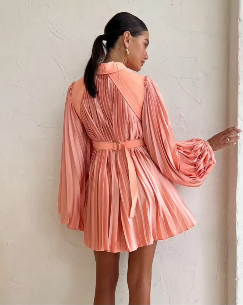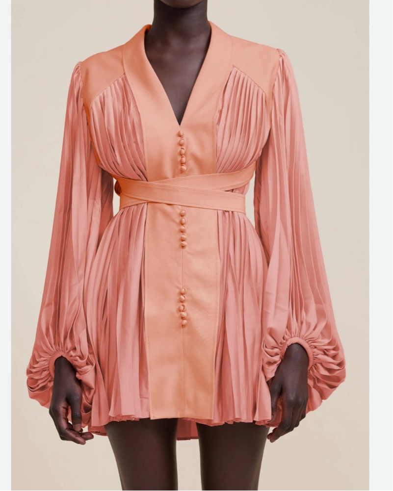 (Runs 2-4-6) This stunning pleated coral satin dress in a vibrant peach tone is perfect for special occasions like weddings, galas, or formal events. The dramatic bell sleeves and cinched waist create a flattering, feminine silhouette. New with tag.