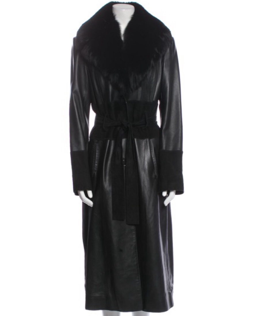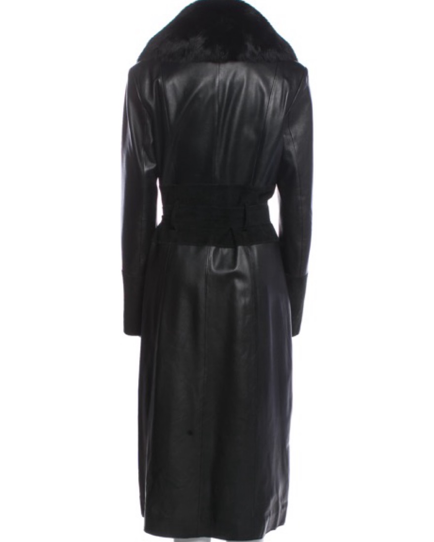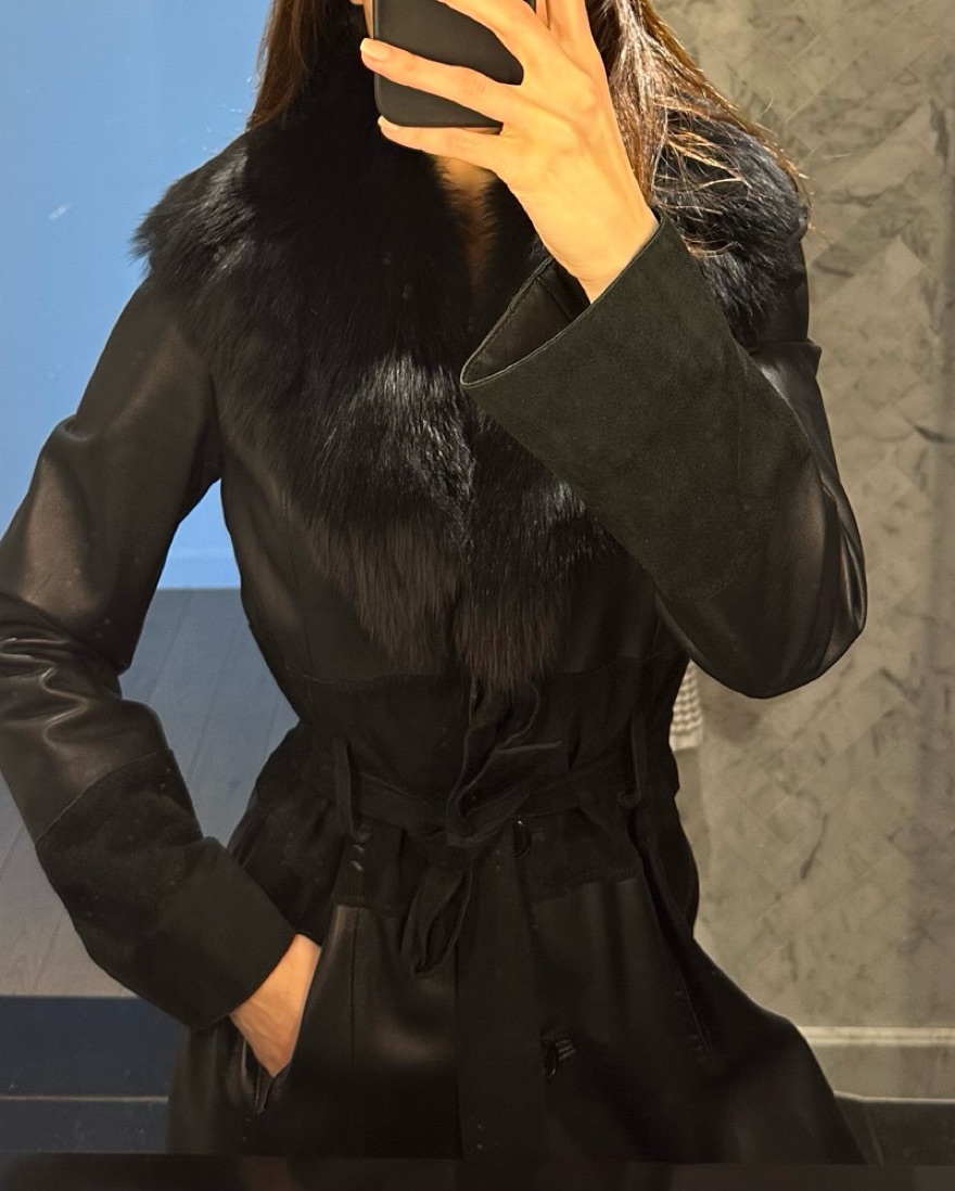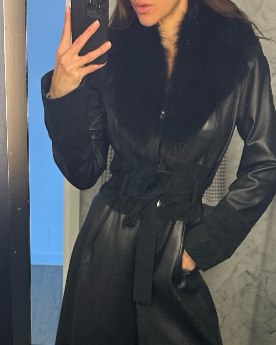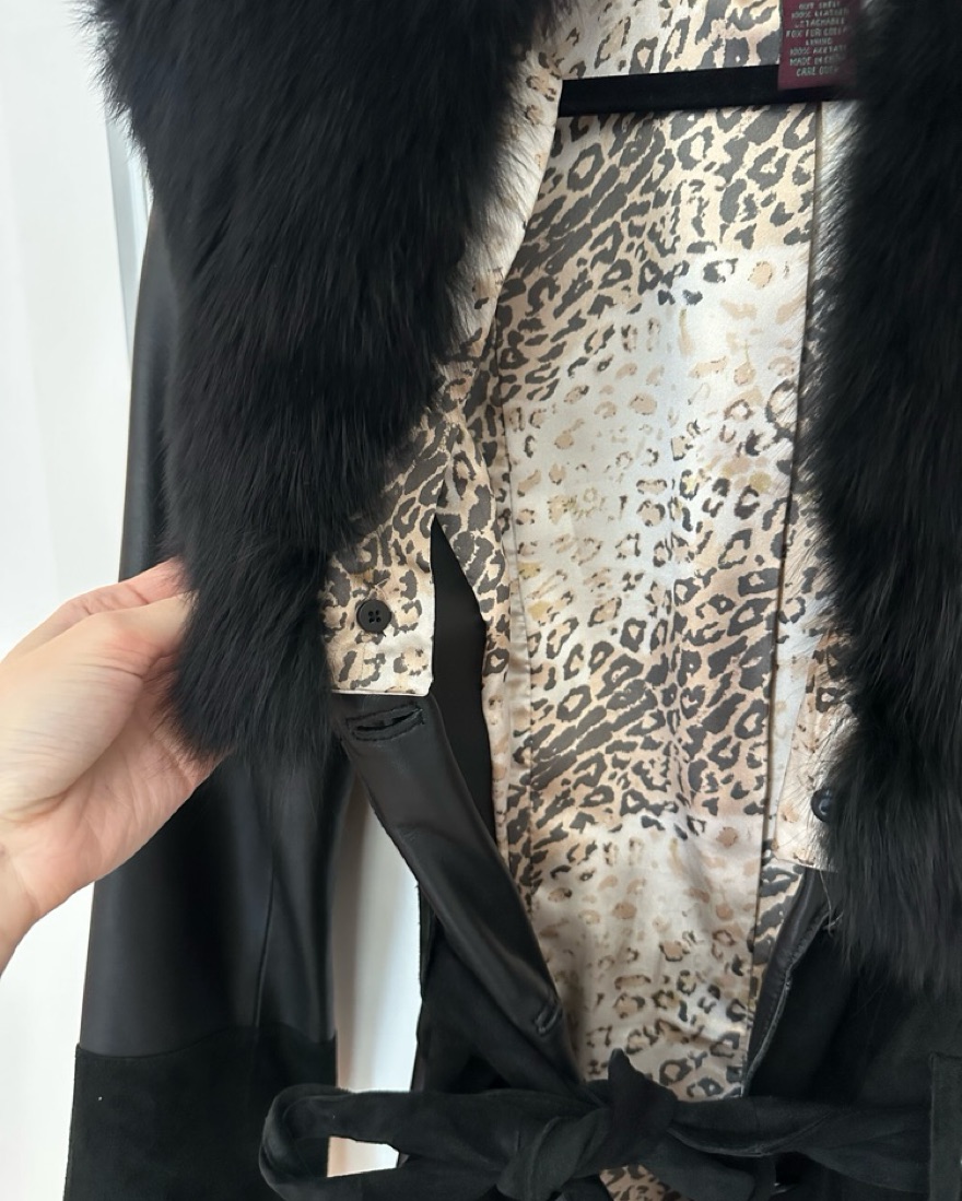 Black midi leather fur coat jacket. Fox fur trim collar. Great condition. Leopard lining. Size medium fits S/M. Use belt to cinch waist. Pockets. Very versatile. Chic & flattering. Brand is Vakko, purchased from Real Real. Minor fading on the suede cuffs and waist. Message me any questions.