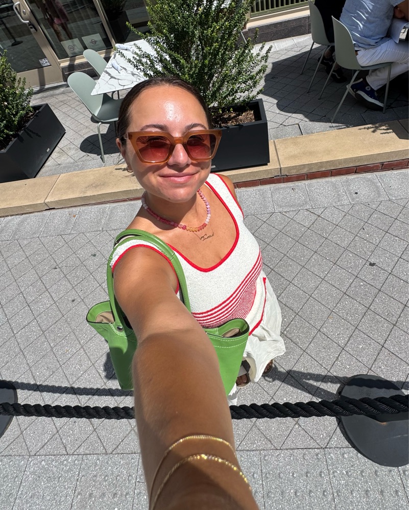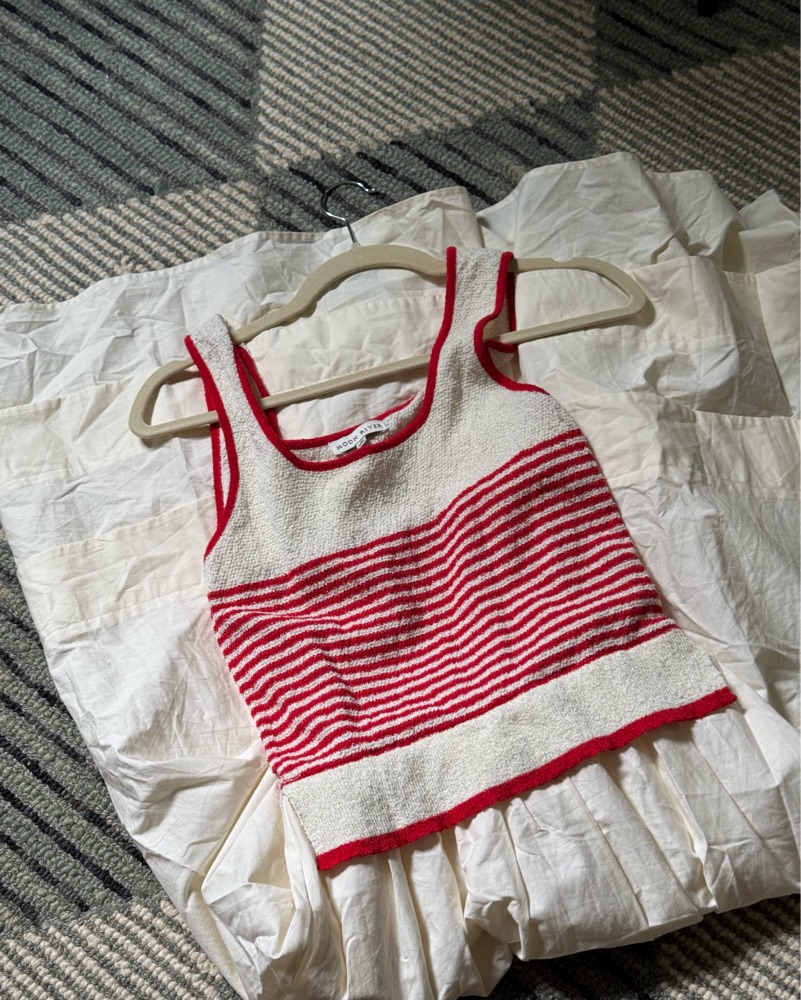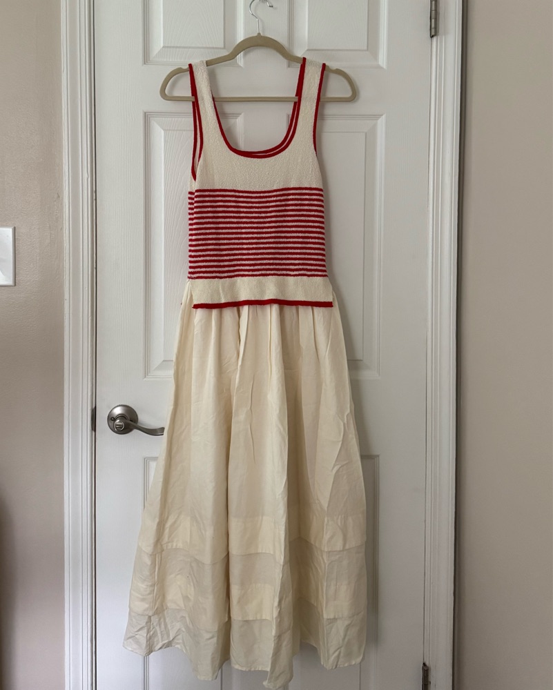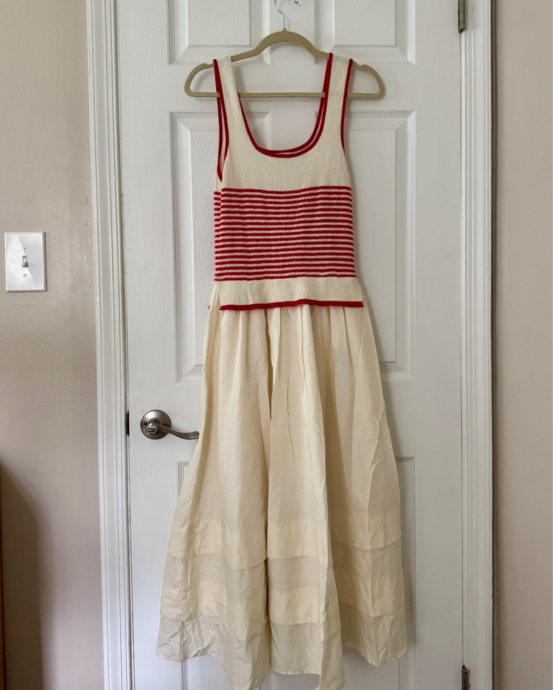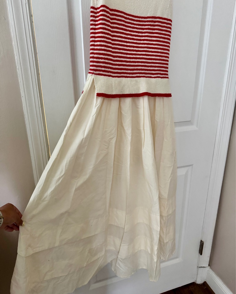 This timeless sundress is perfect for a summer afternoon on the beach or a picnic in the park. The classic red and white stripes and breezy fabric create a chic, effortless look. Size Medium from Moon River. Red is a more bright red and creamy white. A good east coast summer dress!