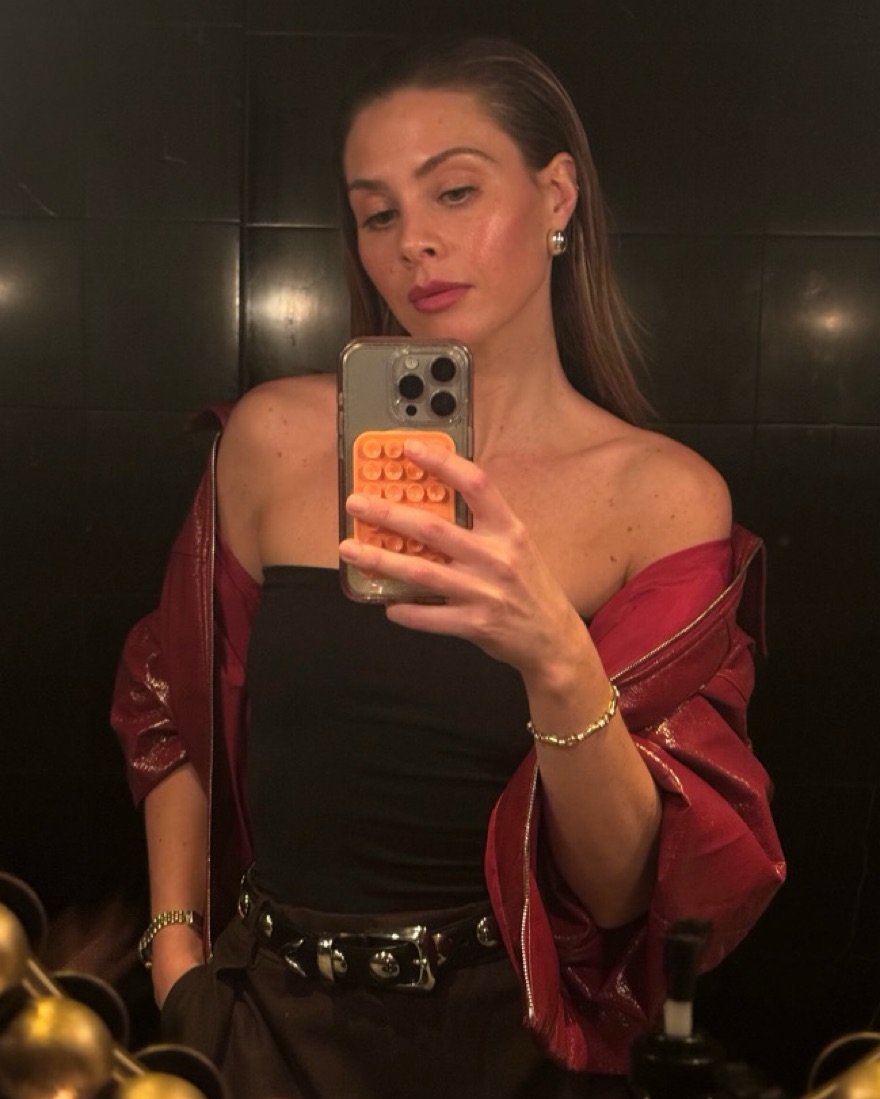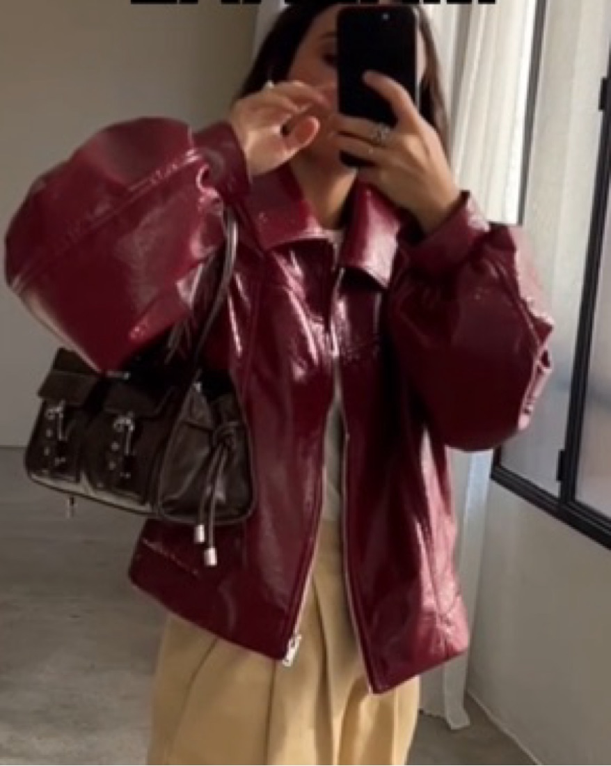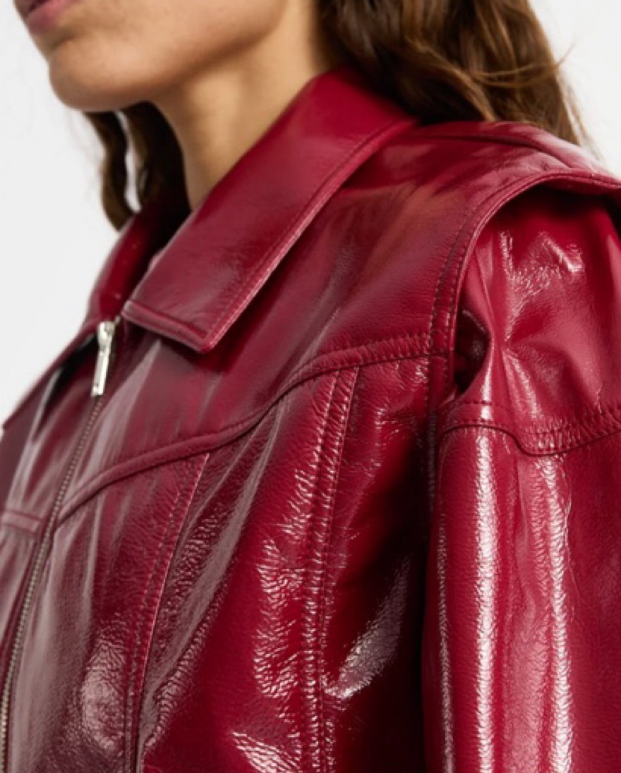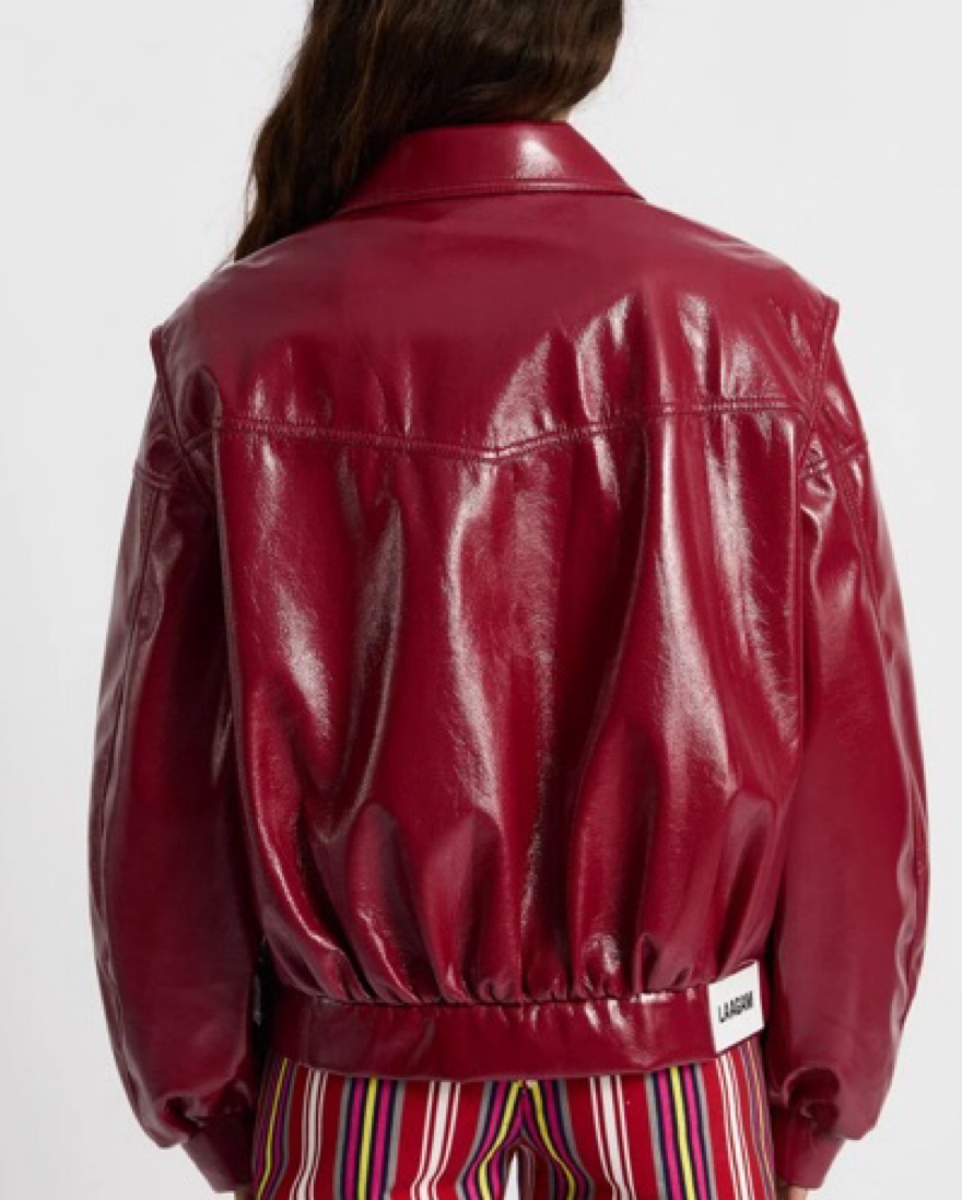 The most perfect Red color, vegan leather bomber jacket featuring a lapel collar and long sleeves. Side pockets. Lining. Front zipper fastening. Made of a shiny fabric. Scrunch the sleeve for a cooler look. Oversized fits 0-6