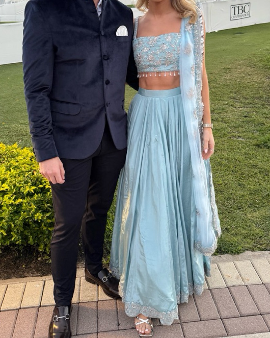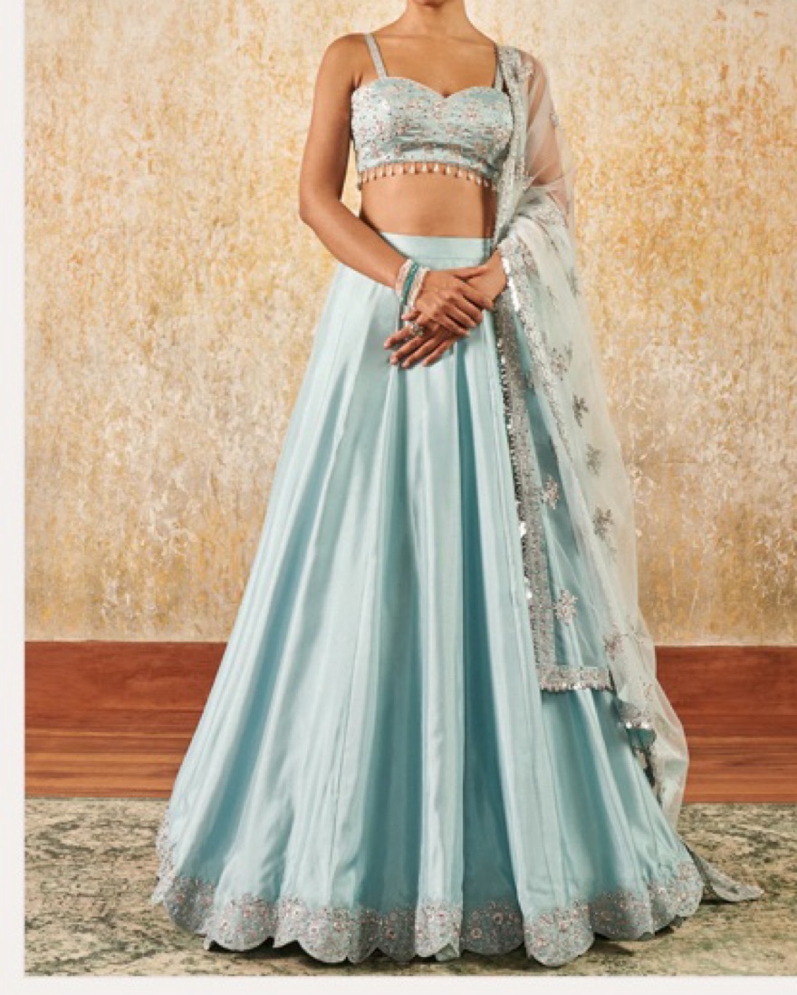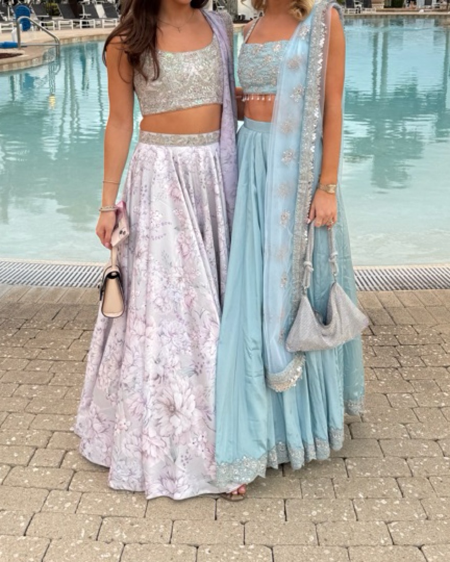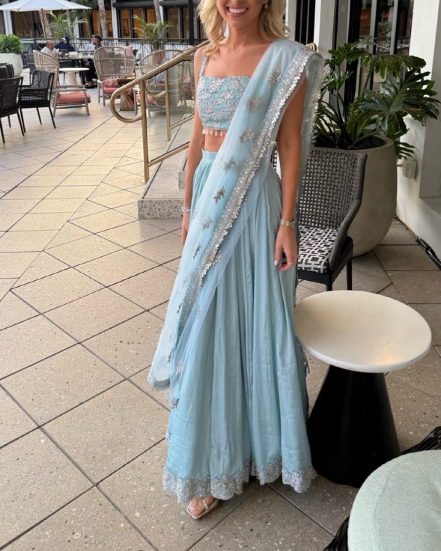lehenga had been rented out a few times and i noticed some staining on the skirt and missing beads on the left side of the top, but i was able to cover it with the dupatta. pretty color for a baraat/daytime ceremony. skirt was a bit long on me since i’m 5’3” so i needed 4 inch heels.