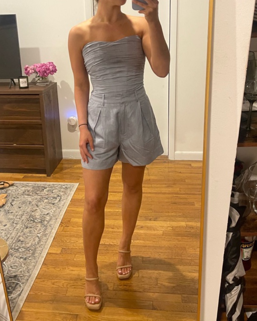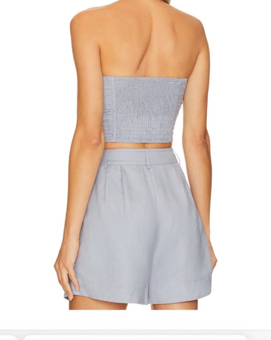 ASTR the Label Jessamine Top in Slate Blue. Strapless top with boned bodice and ruched stretchy back. Side zipper closure. Size small.