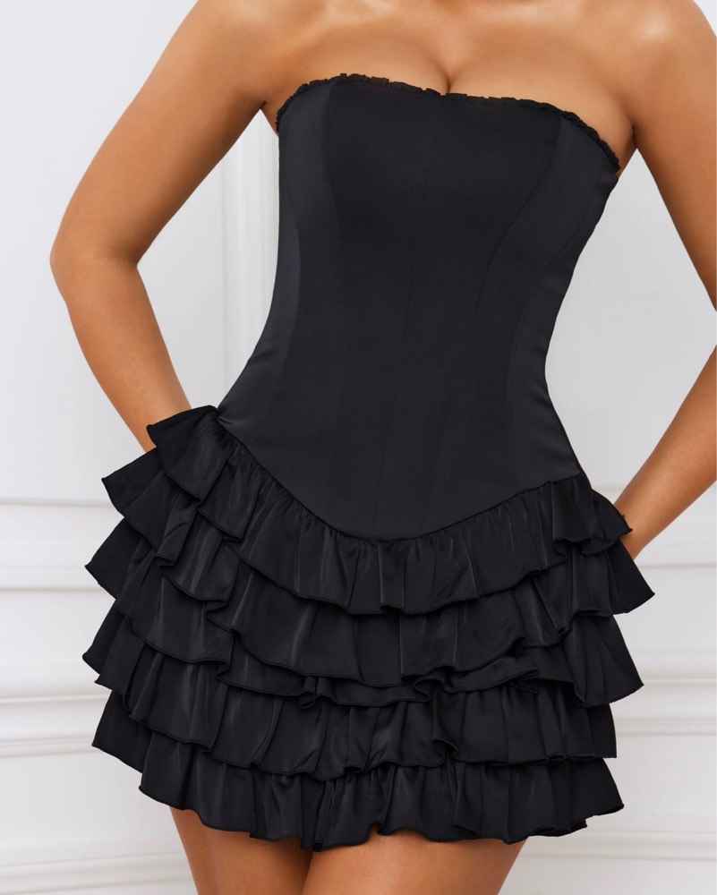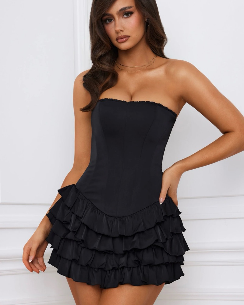 Turn heads in this stunning black mini dress from Oh Polly, designed with a structured corset bodice to snatch the waist and give that hourglass shape. The strapless bandeau neckline pairs perfectly with the tiered ruffle skirt for