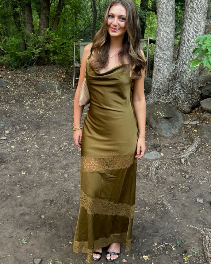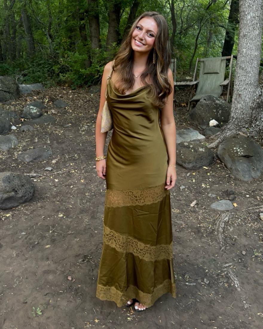 Olive green maxi dress size medium, worn once, so flattering and unique, very comfortable, like new condition