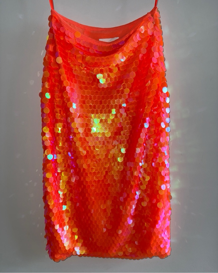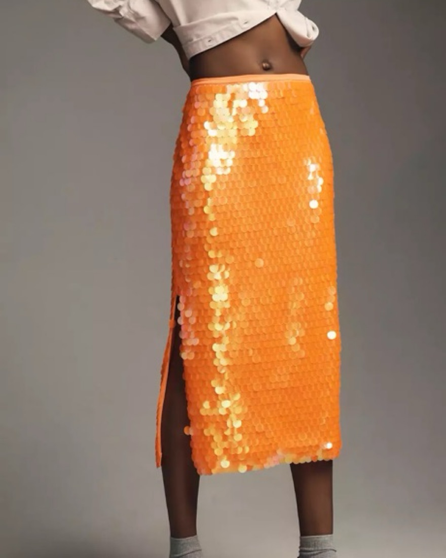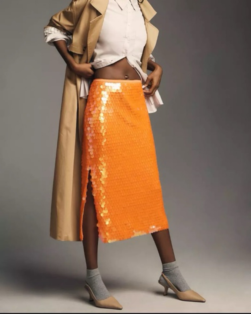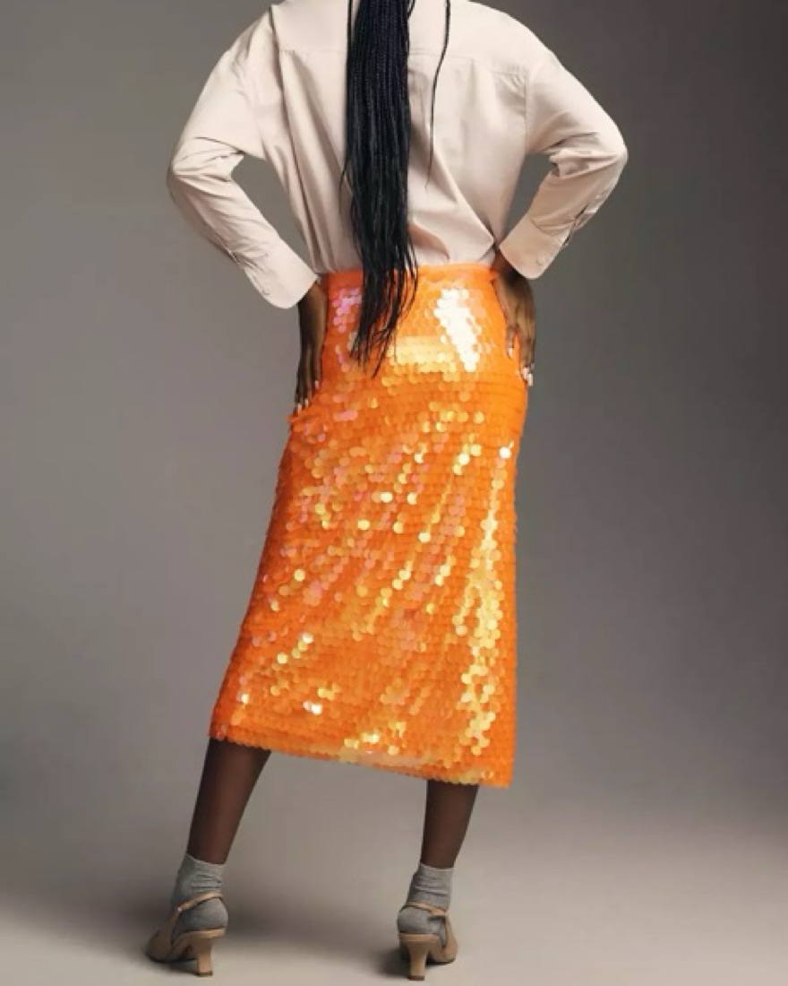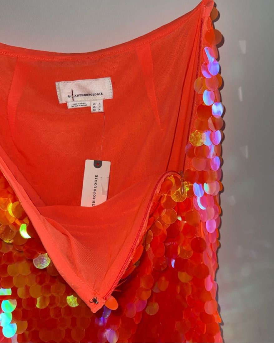 By Anthropologie Neon Paillette Sequin Midi Skirt. It features all over shimmering sequins in a bright neon orange color. New condition. Side slit. Side zipper. Fully lined. Tag size 2 but anthropologie runs big so it also fits size 4. See last my 2 photos that showcase the amazing color!!
