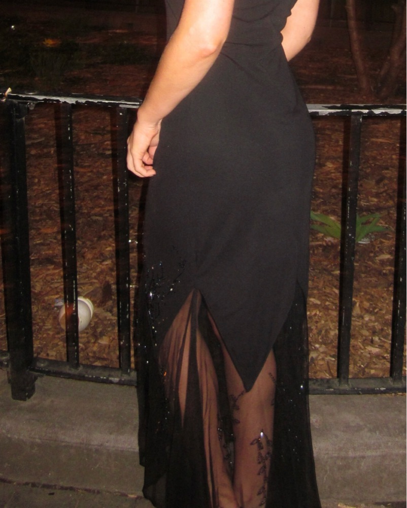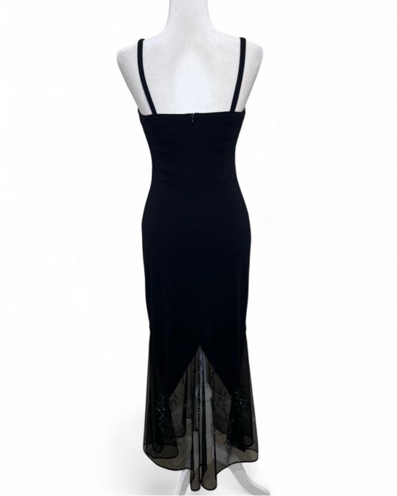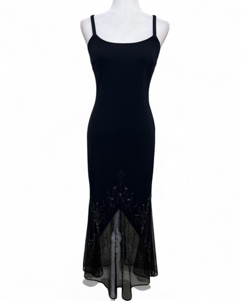 This is a vintage dress by Joseph Ribkoff couture from the 90s. Simplistic upper half with a midi flare mesh with black beading details. Very elegant- Size 4, US M/S