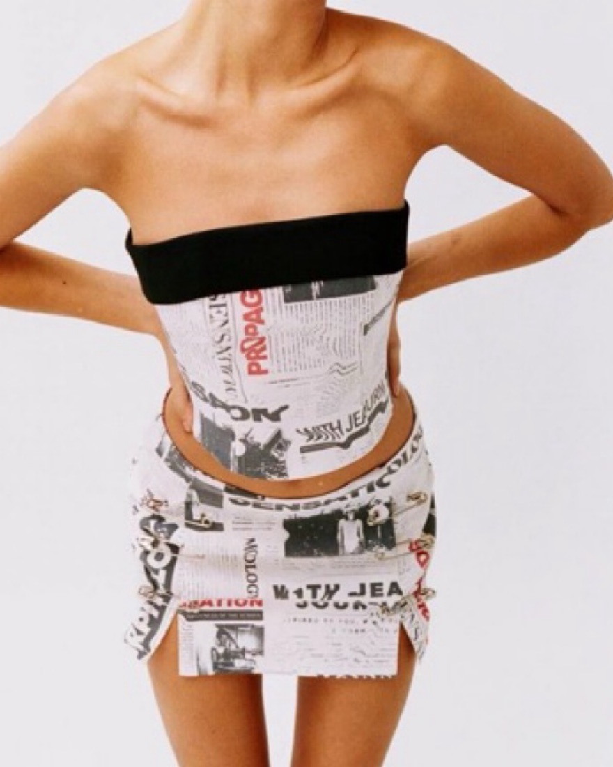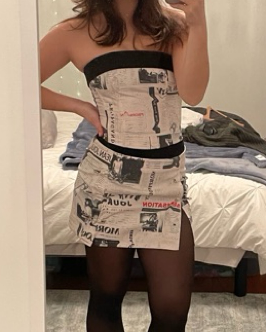 This bold and eye-catching matching set is perfect for a night out on the town. The newspaper print fabric adds an edgy, urban vibe that is sure to turn heads. Small top & small skirt.