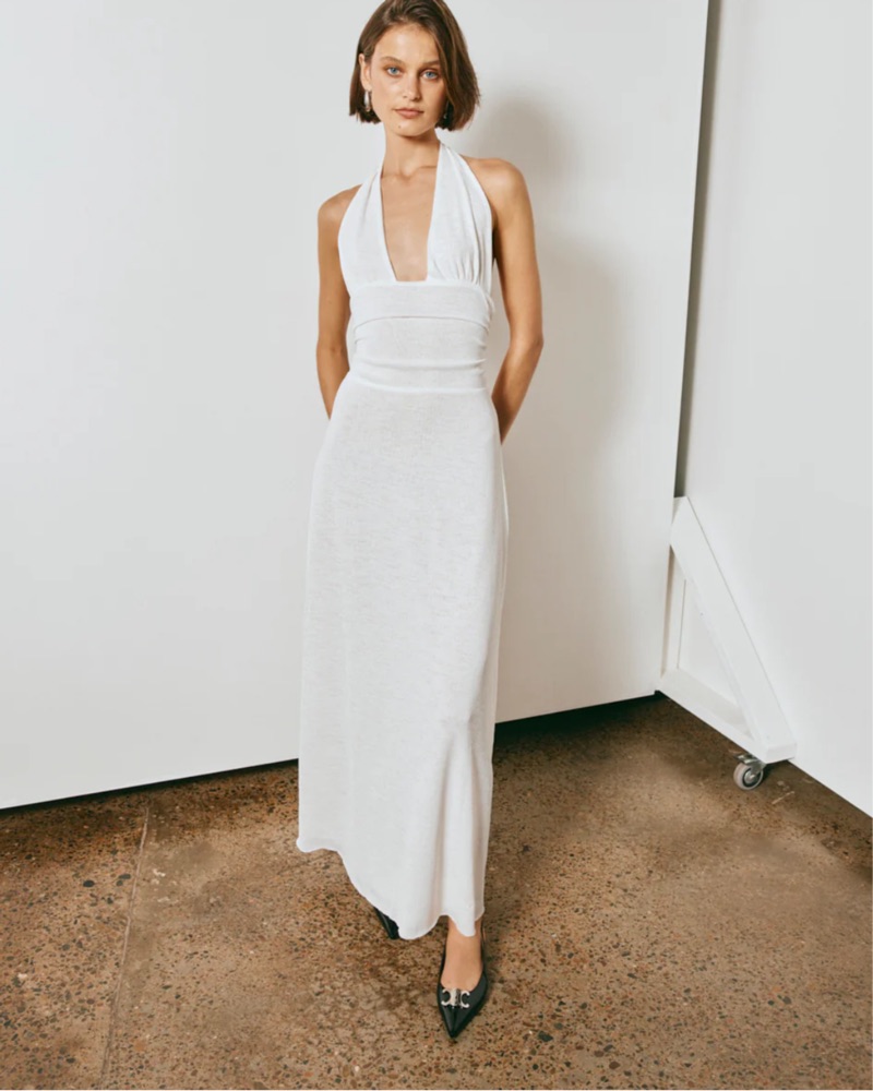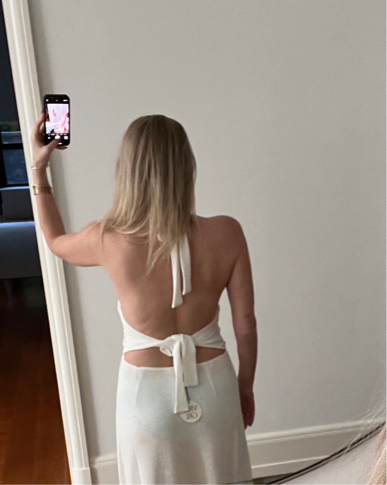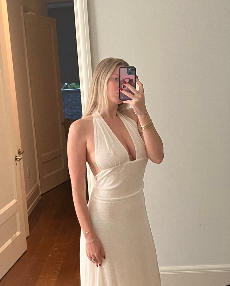 This stunning white halter maxi dress is perfect for a formal event or special occasion. The sleek and flowing silhouette is both sophisticated and elegant. Slight see through, will have to wear nude undergarments and/or pasties. Good bust support. Linen like material.