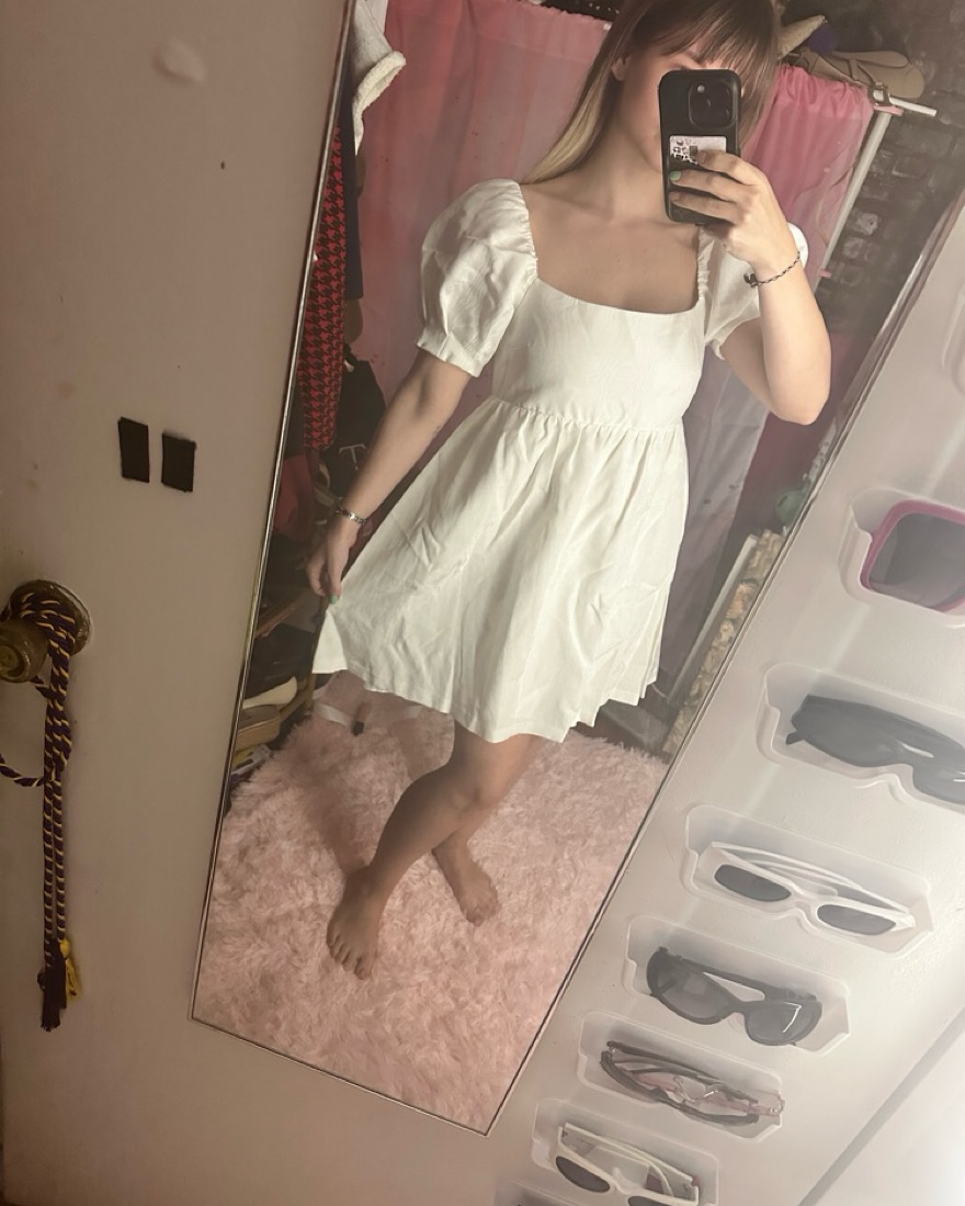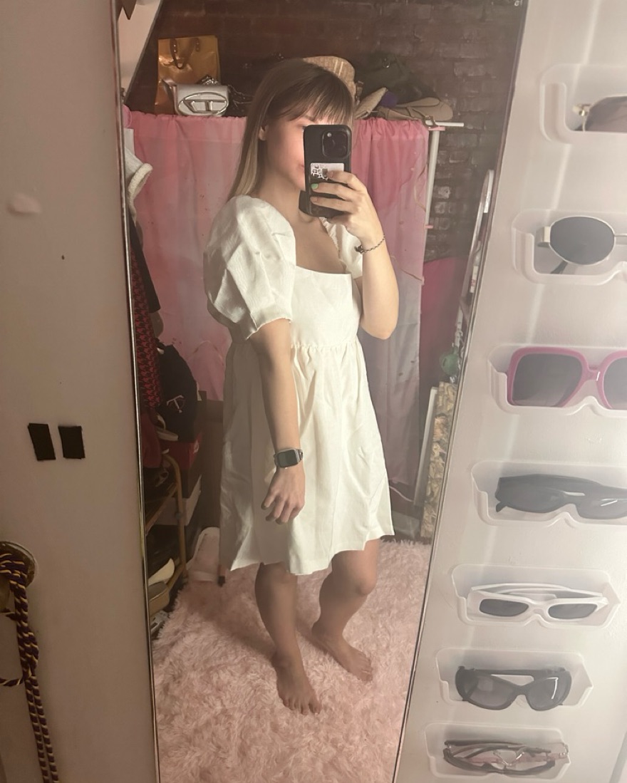white mini dress with puff sleeves, zip back, and empire waist. thick cotton blend. i will steam it before sending it out so it’s nice and smooth! size s.