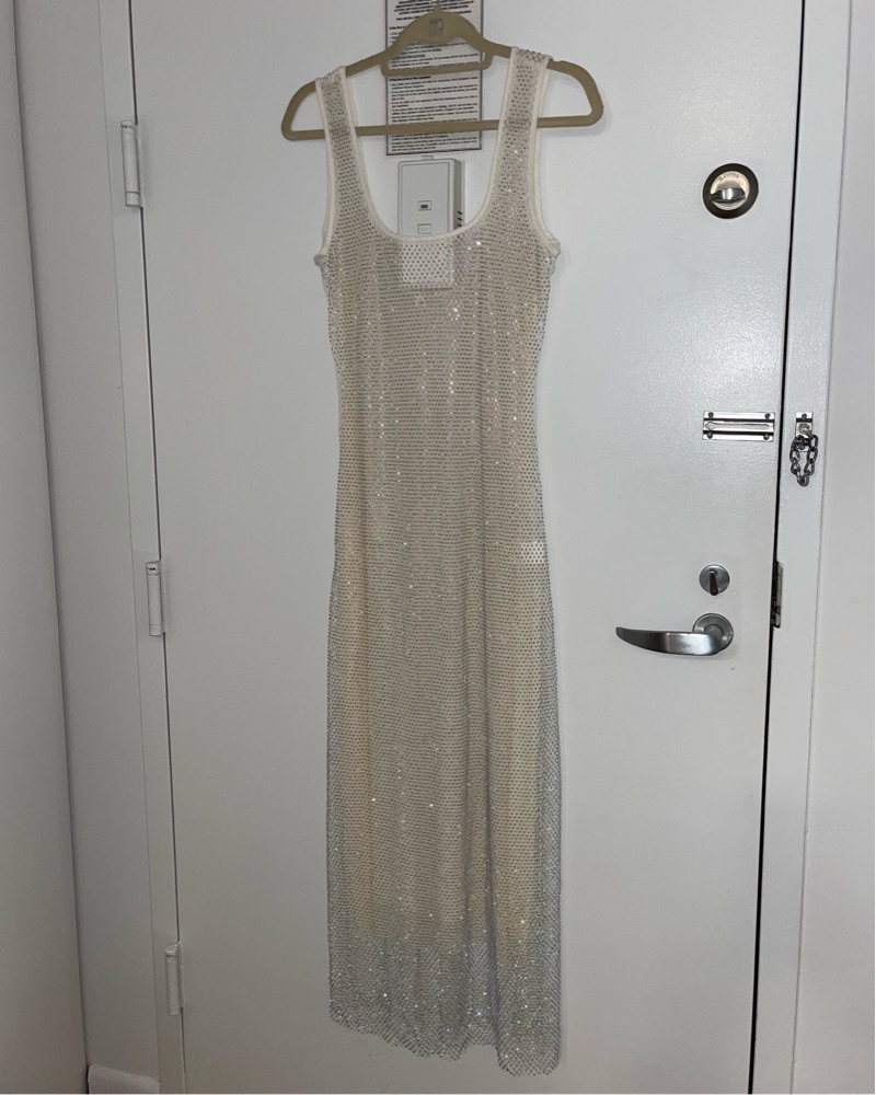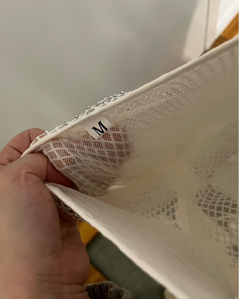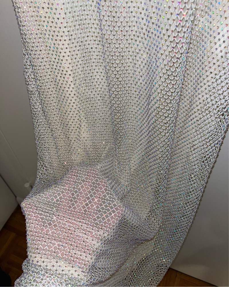 Mesh underlining with sequin white fishnet over. Size M, will fit someone with curves. Perfect for night out or a vacation!