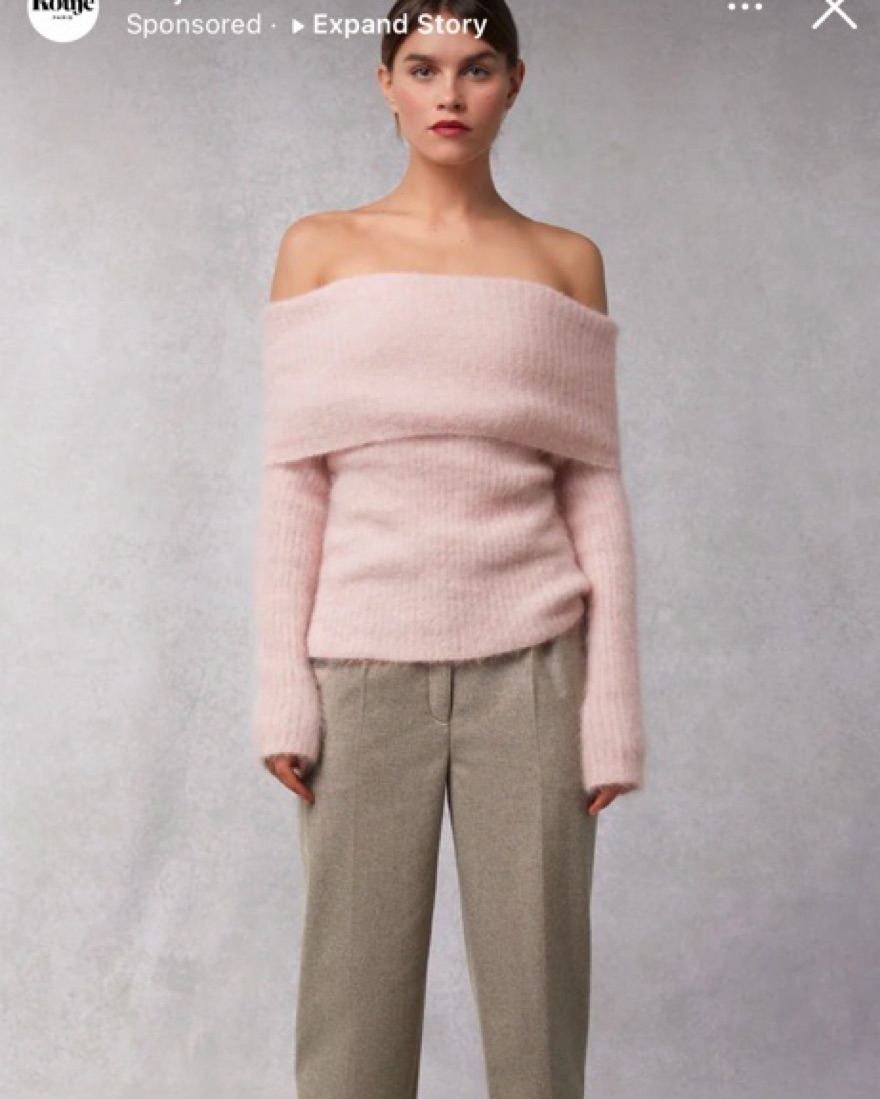 Cute off shoulder baby pink off shoulder top. Its made of mohair and alpaca fabric. Do not rent this top if you are clumsy and might get a stain