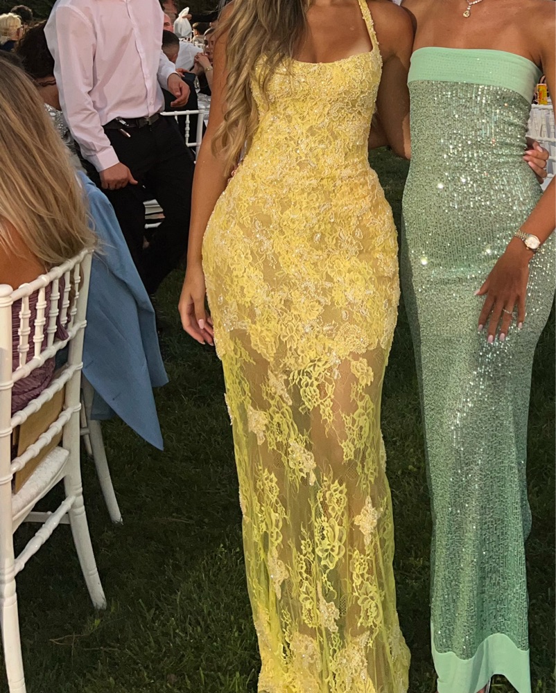 Valdrin Sahiti Yellow Lace Sparkly Gown