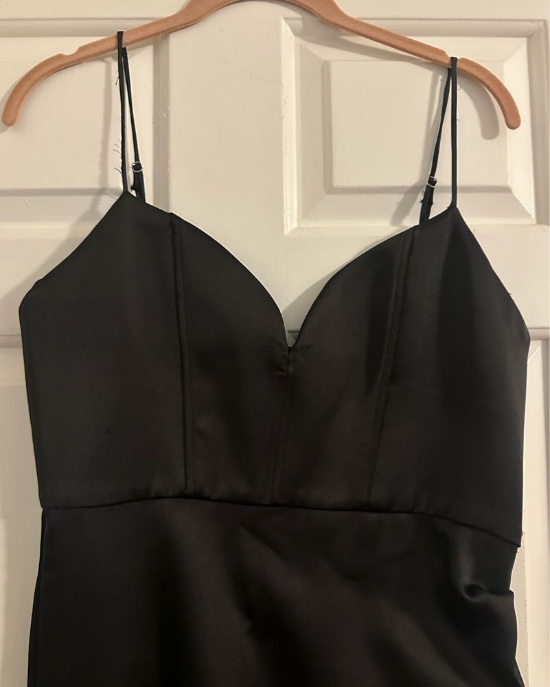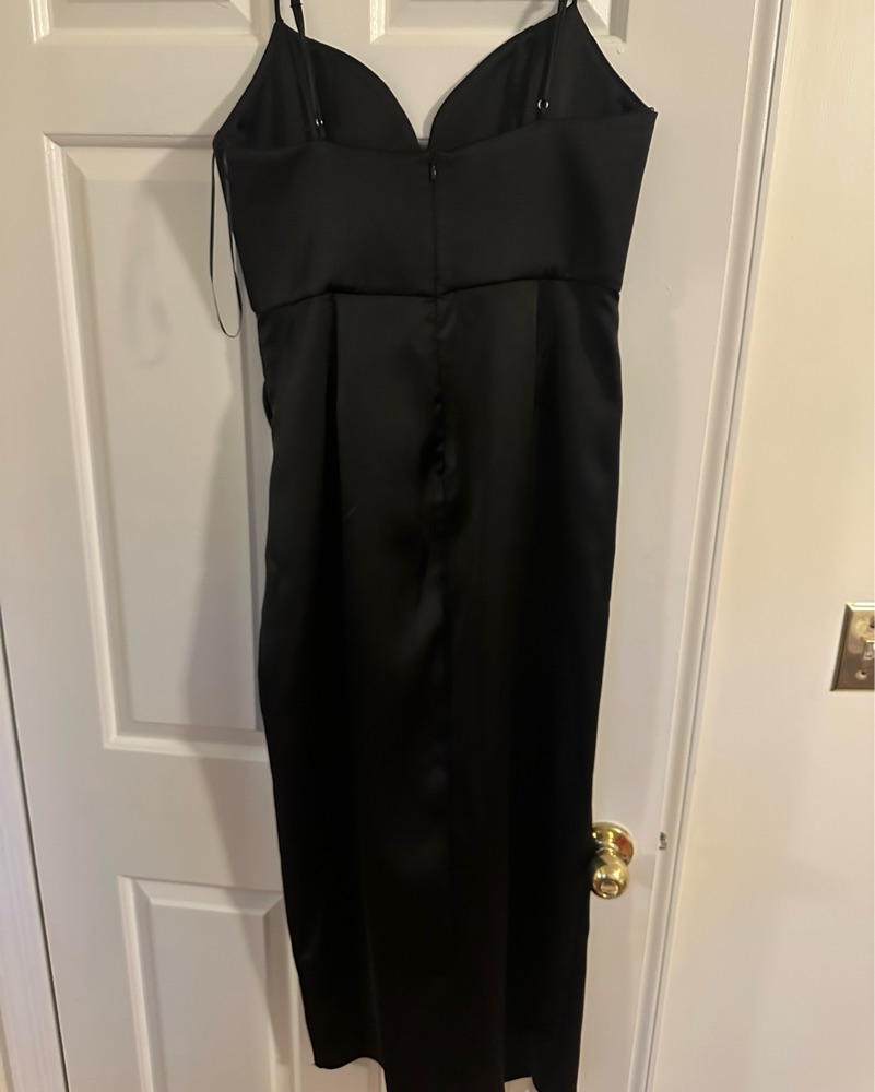 This stunning black dress exudes elegance and style, making it perfect for a formal event or special occasion.