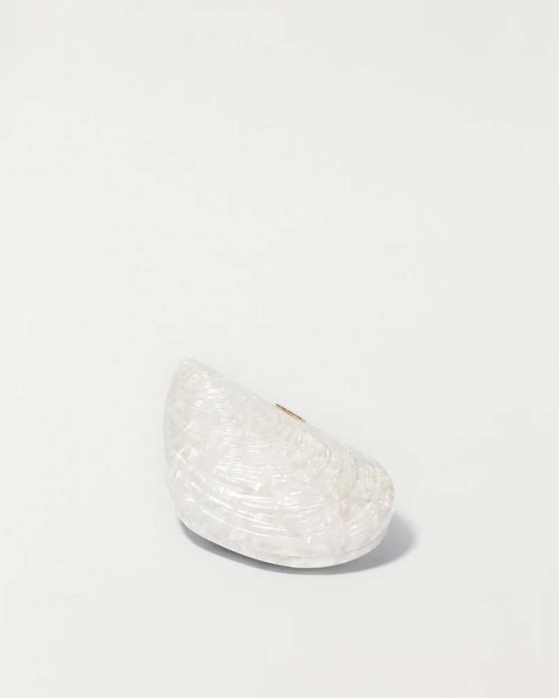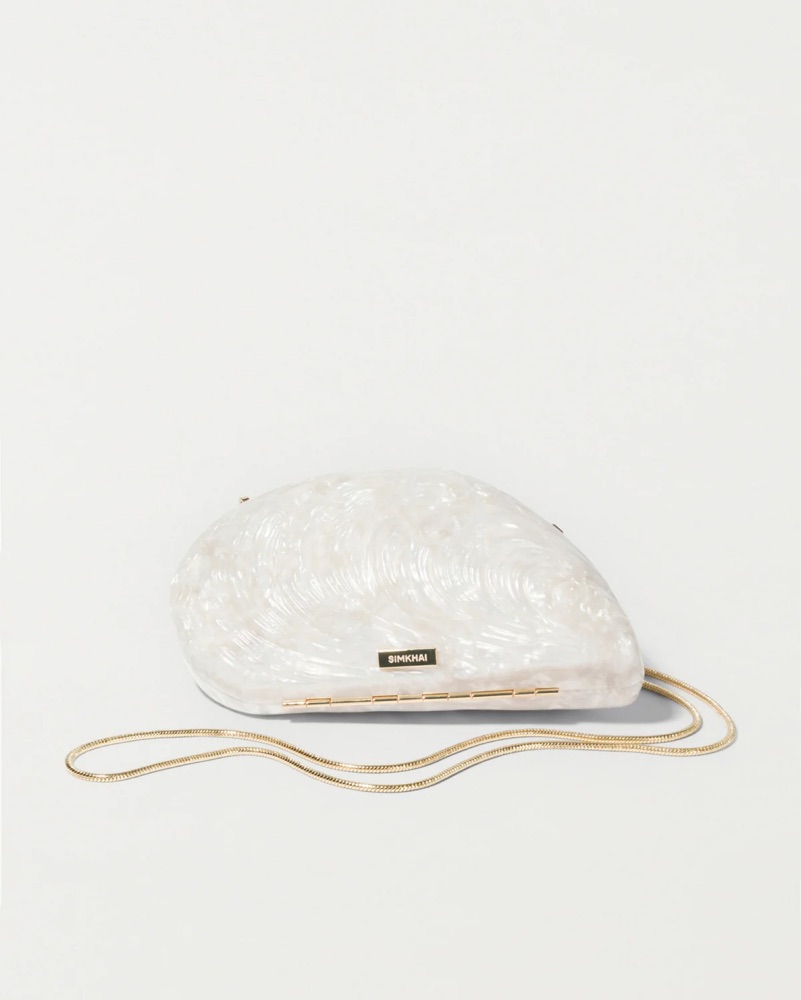 The Bridget Pearl Clutch in White. Inspired by the natural beauty of the sea, this hard shell clutch features a stunning oyster shell design. The lustrous pearlescent finish and intricate detailing create a captivating and luxurious look. Lined interior, and removable metal chain shoulder strap.