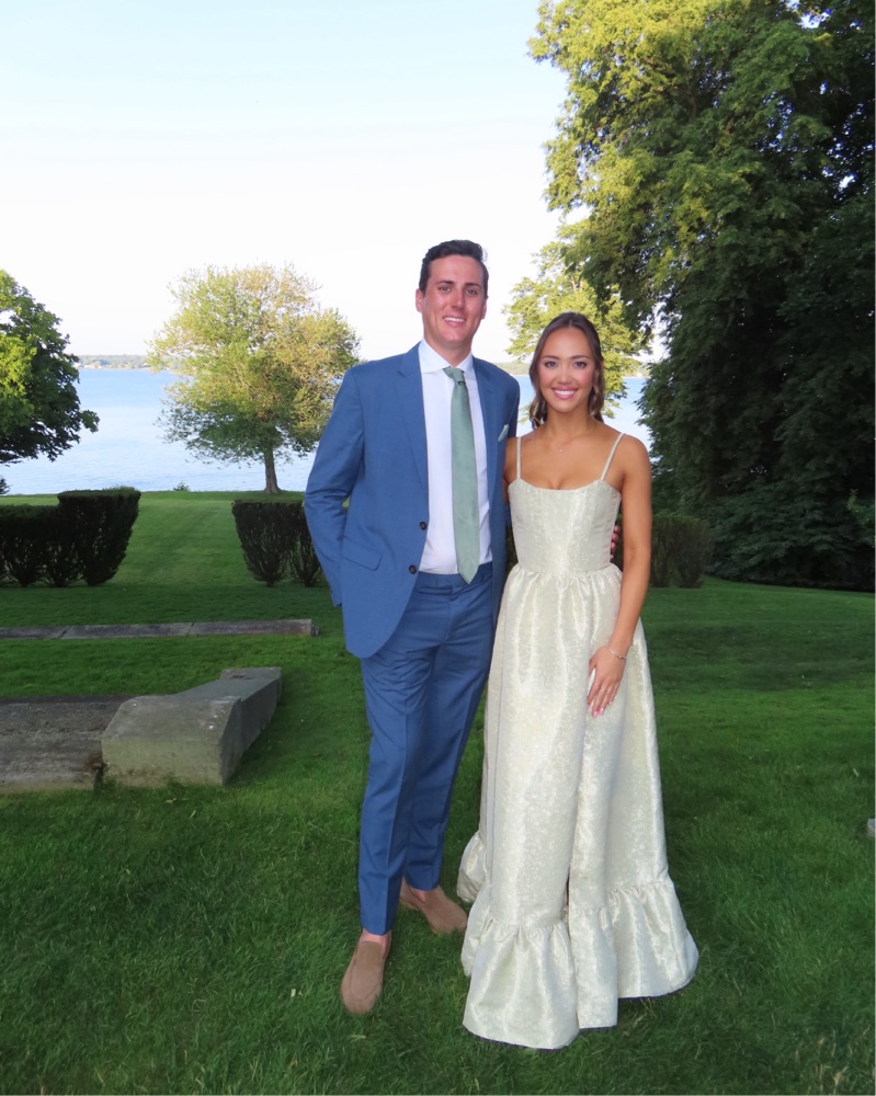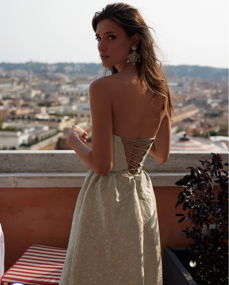 Beautiful green gown - slit and corset back. I added straps but they can easily be tucked in if you want the strapless look! I’m 5’7, 130lb and wore tiny heels in the picture