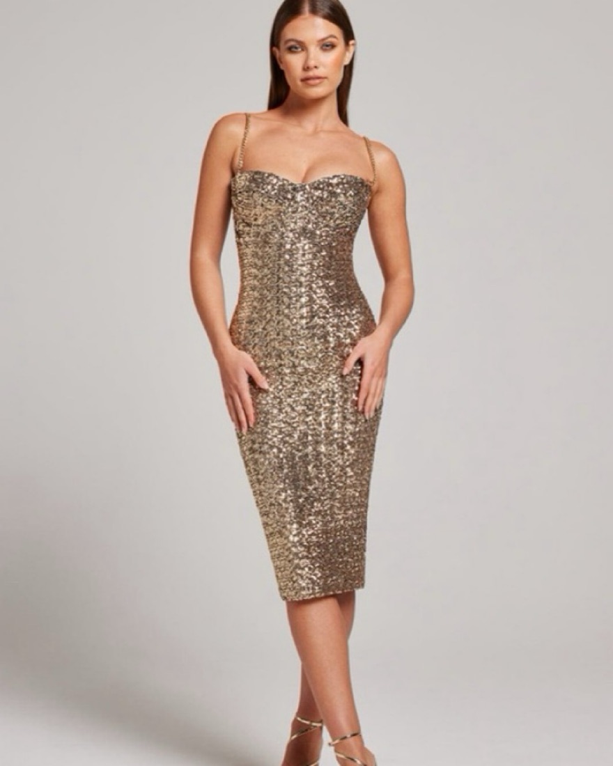 This dress is size s/m. Gold; figure-hugging in luxurious sequin, this is the perfect sophisticated midi dress. Made from our exclusive gold stretch sequin fabric. This classic silhouette has a fully boned and fused under corset that cinches in the torso and waist for that perfect silhouette.