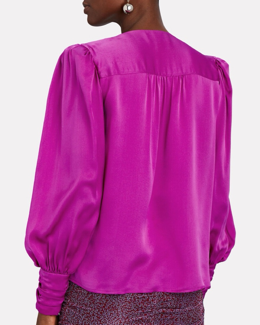 This exquisite silk blouse in a bold fuschia hue is perfect for a night out or special occasion. The voluminous puff sleeves and buttoned front lend a modern, high-fashion flair. SIZE P but runs a little loose so I marked as S!!!!!!