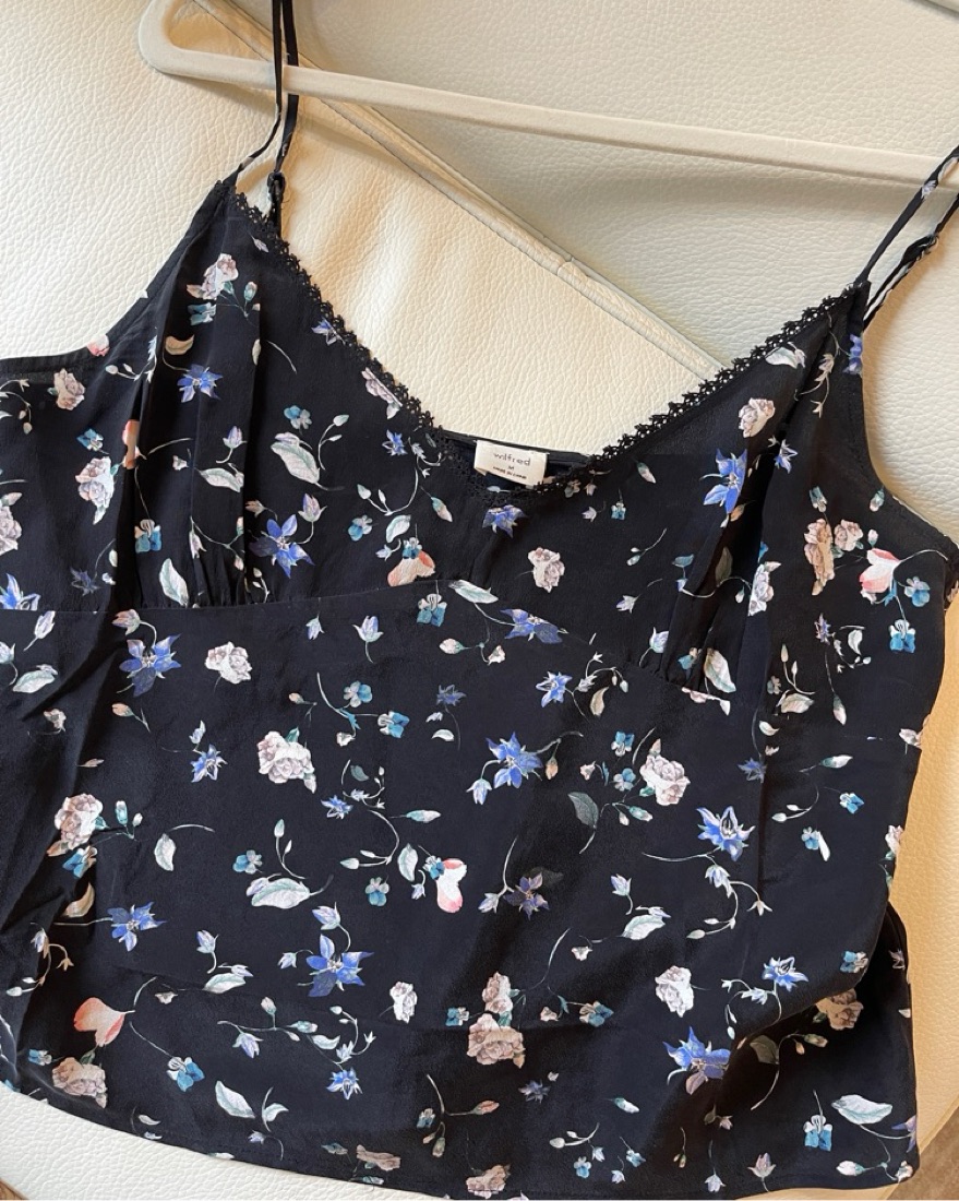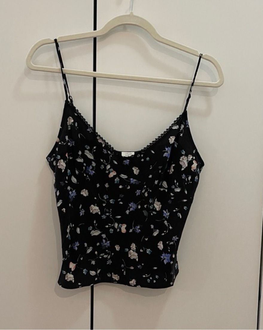 Wilfred Aritzia floral camisole. Black with cool color flower print. Sized up to a M for a looser look. 100% silk. Only worn twice in perfect condition.