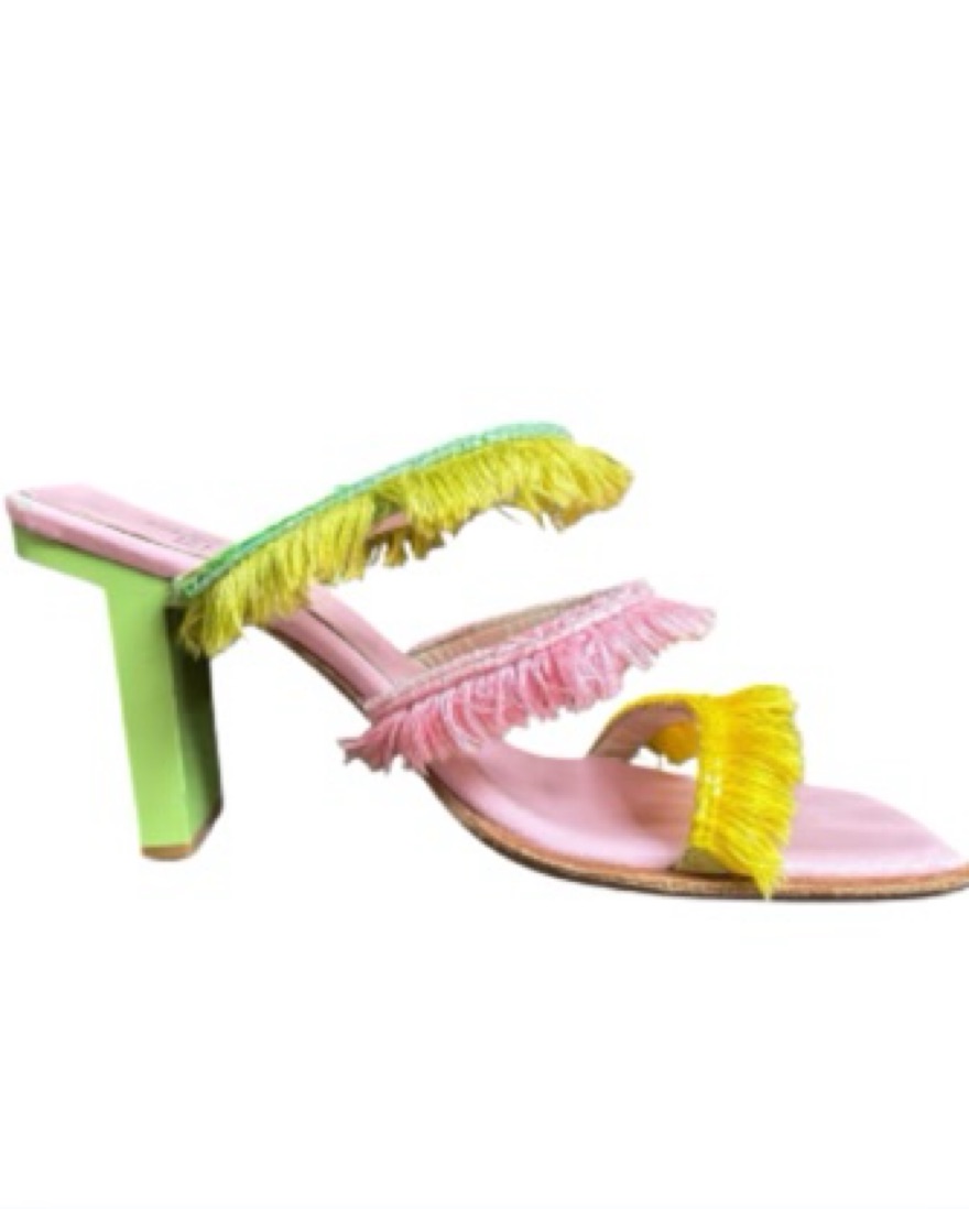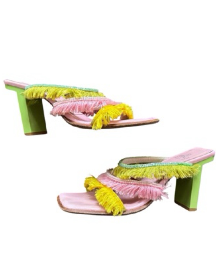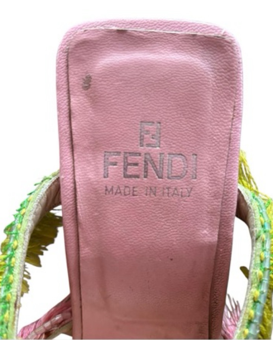 Fendi tri-color fringe mules (pink, yellow and green) with pink leather insoles and a green coated wooden block heel. Due to age, item may feature loose threads and/or cracking, peeling or smalls stains on insoles and heel. Logo fading on insole. US women’s 6.