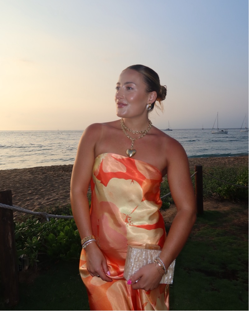 This stunning chiffon gown is perfect for a beachside celebration or elegant evening event. The vibrant floral print and draped silhouette create a sophisticated yet alluring look.