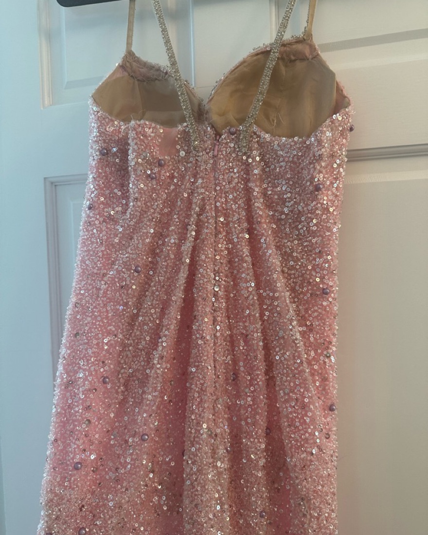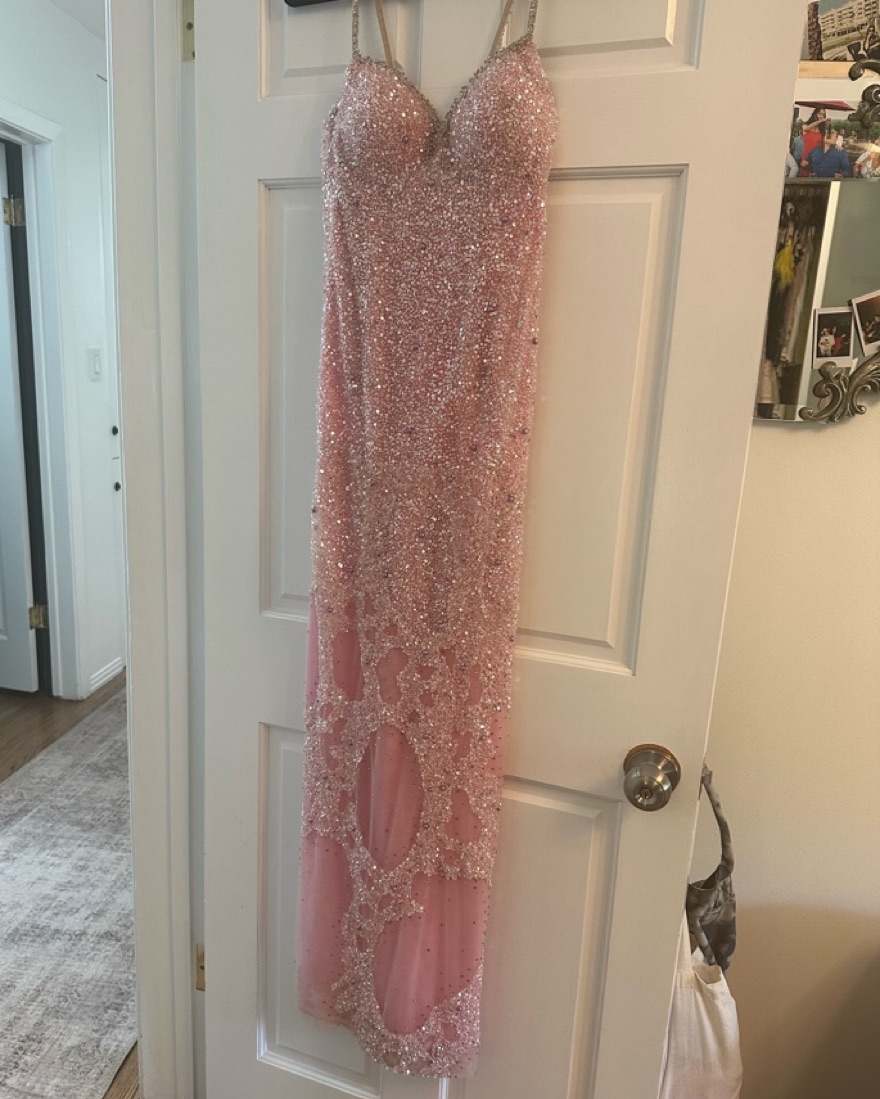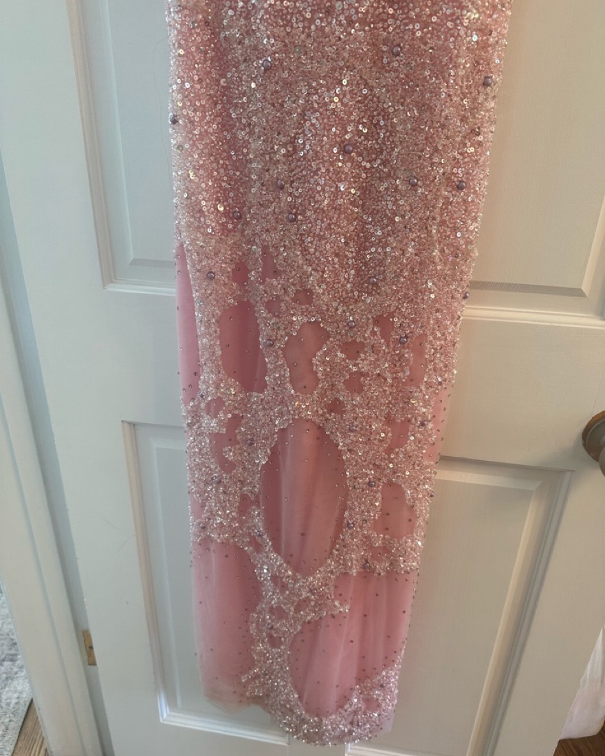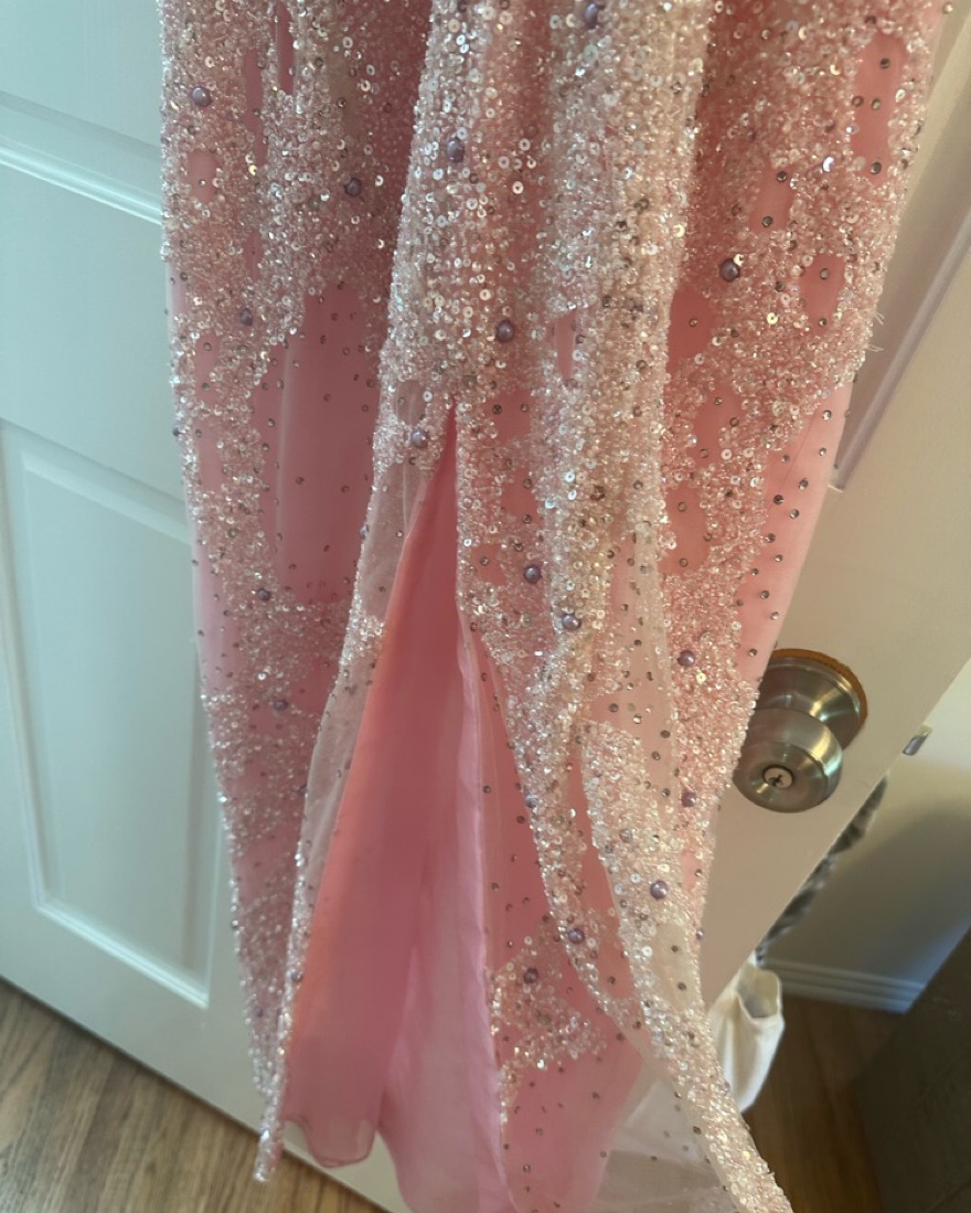 Pink beaded couture gown by iranian designer Simin, tiny slit in the back, lined gown, very flattering. Fits a size 0-2. Cup size fits a 32b + 34B