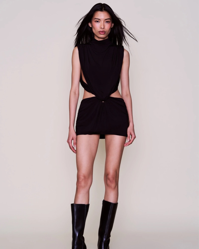 The Shyla Mini Dress features a fluid, high-neck silhouette with dramatic open sides and a twisted front detail that meets at the waist. The skirt drapes low on the hips, balanced by a barely-there back with adjustable ties. Fully lined. Pull-on style. FITS XS-Sm