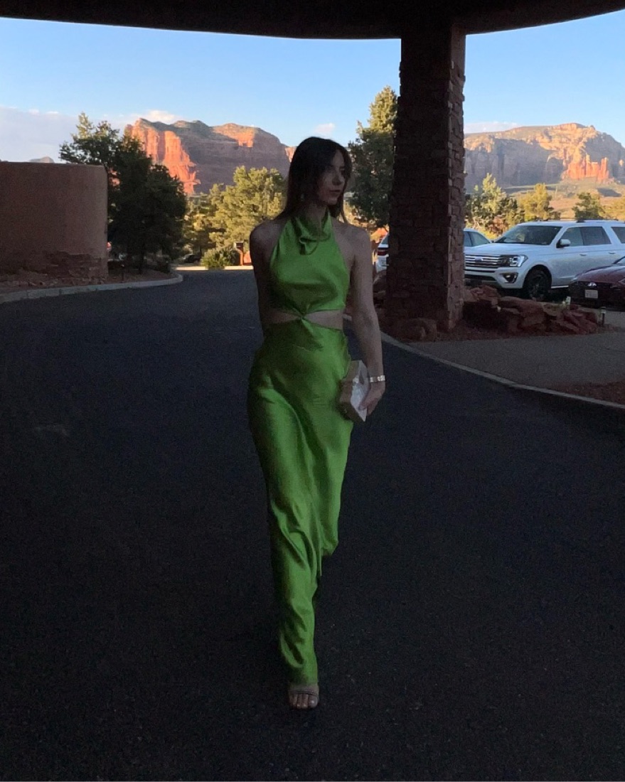 Vibrant emerald green gown, perfect for a formal event or special occasion. Sleek, form-fitting silhouette and open back design create an elegant and sophisticated look. Message for any questions on sizing or length. Needs extra care as it is silk and long. Please dry clean before return:)