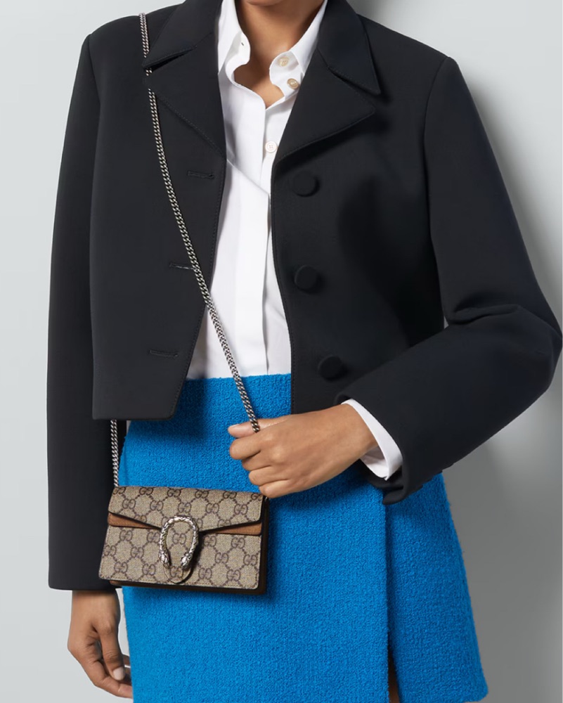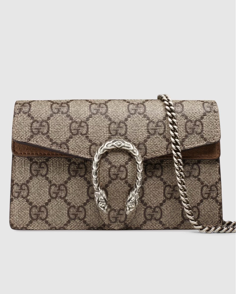 This chic Gucci Dionysus shoulder bag is perfect for a night out or a special occasion. Chain shoulder strap with 23.6" drop. Pin closure with side release 6.5" Wx 3.9" H x 1.6" D