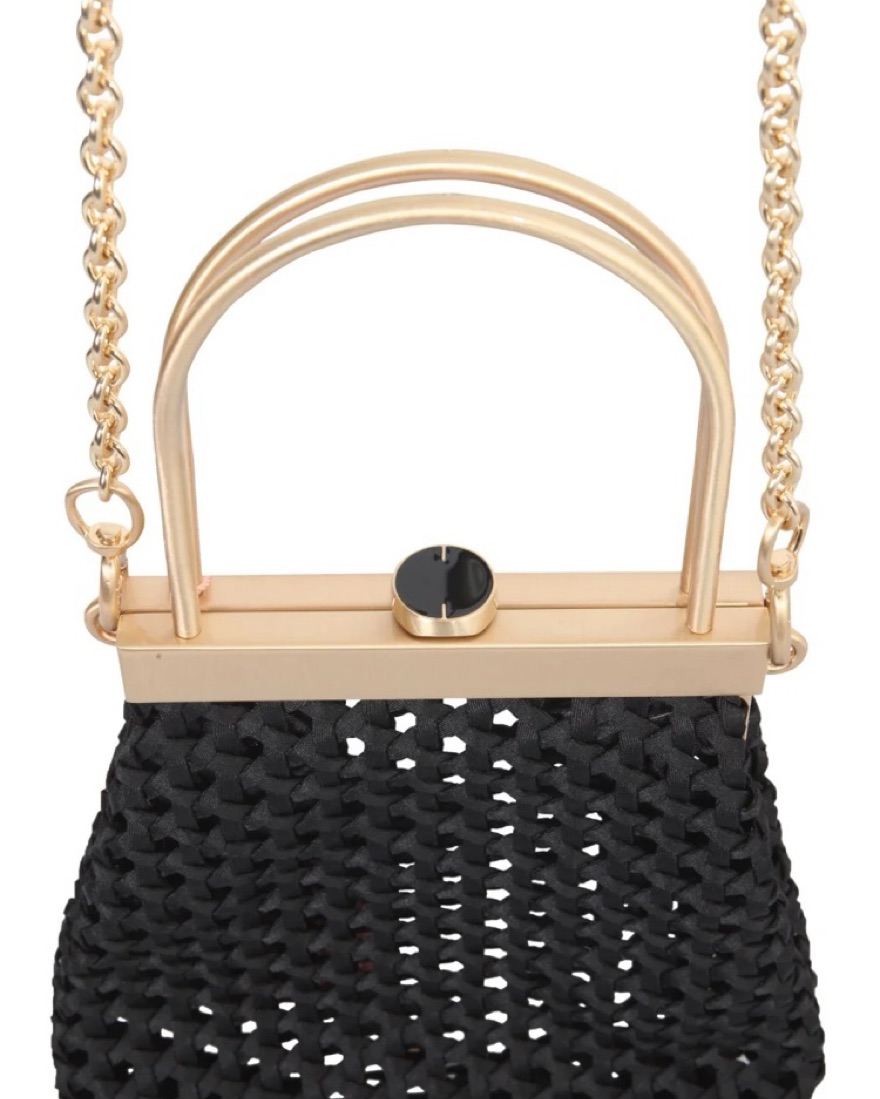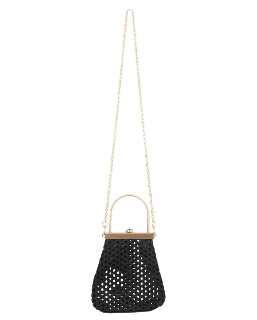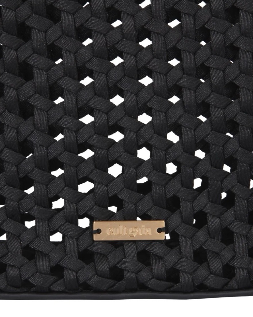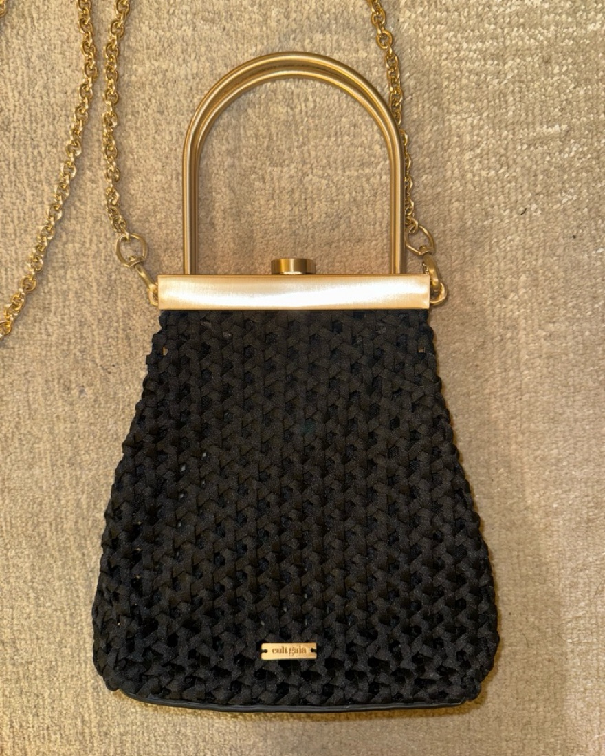 Cult Gaia Hana Crossbody bag with gold hardware, gold handle, long gold chain, clasp opening and a soft interior.