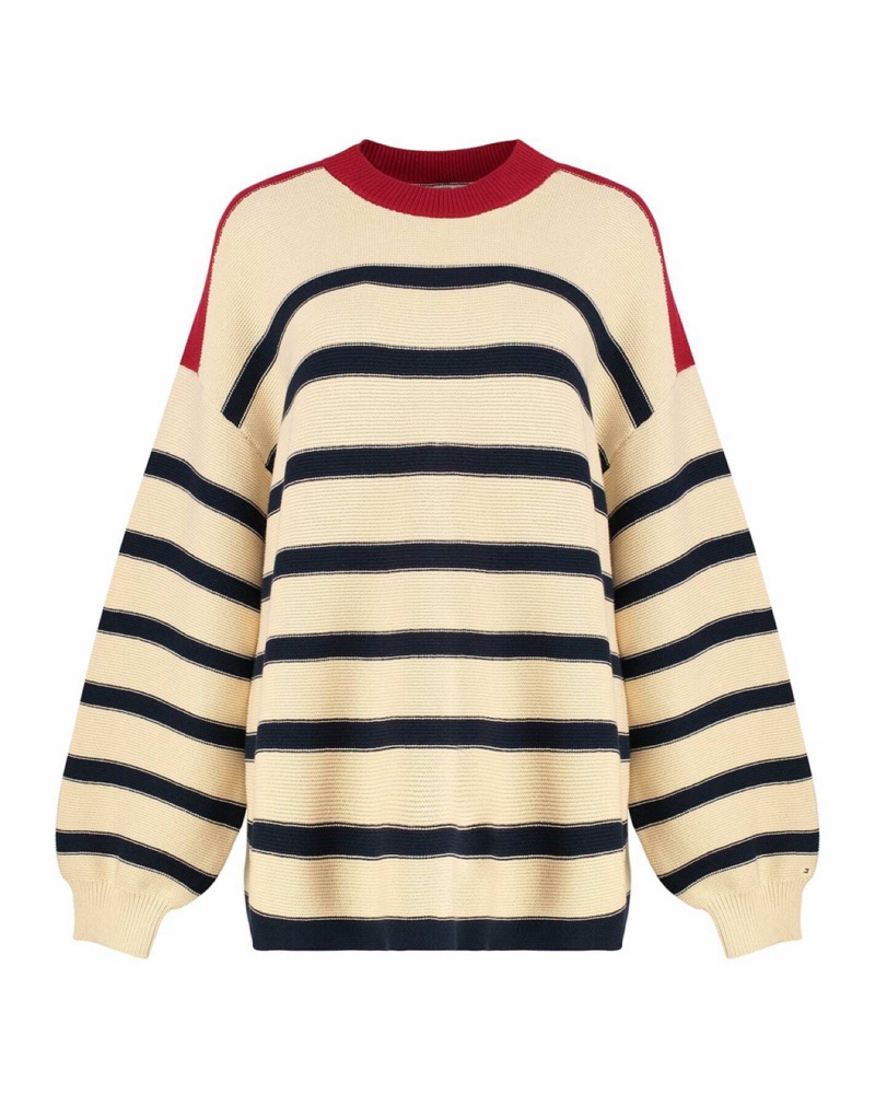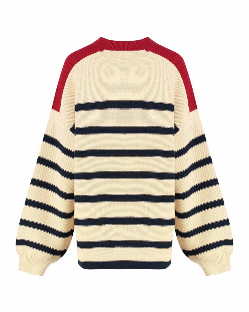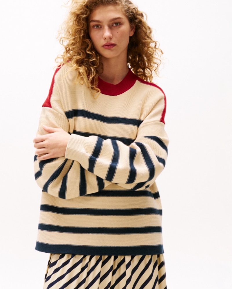 This oversized striped sweater is perfect for casual weekend wear or layering under a jacket. The soft, ribbed knit fabric will keep you warm and comfortable.