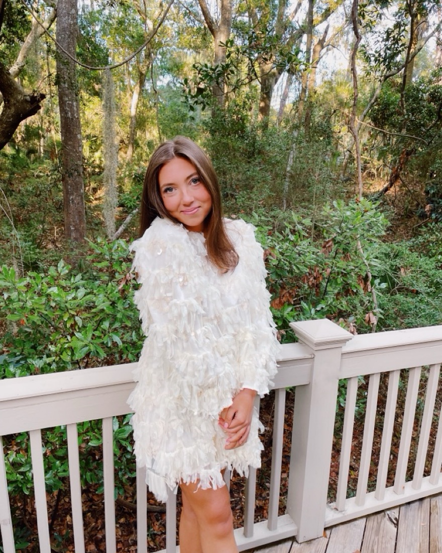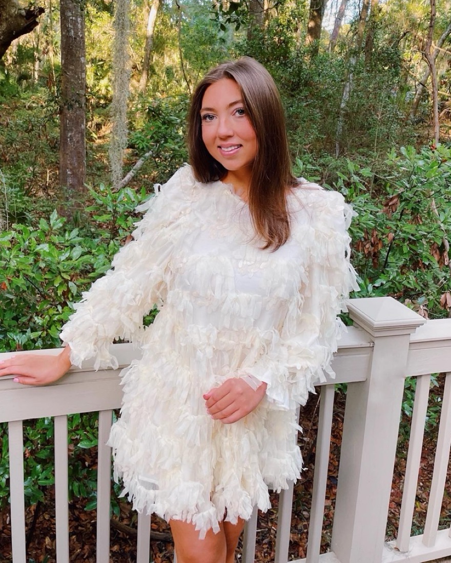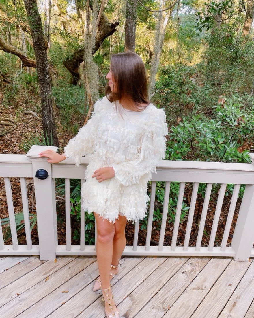 White feathered long-sleeve mini dress is perfect for brides or anyone looking for a LWD!