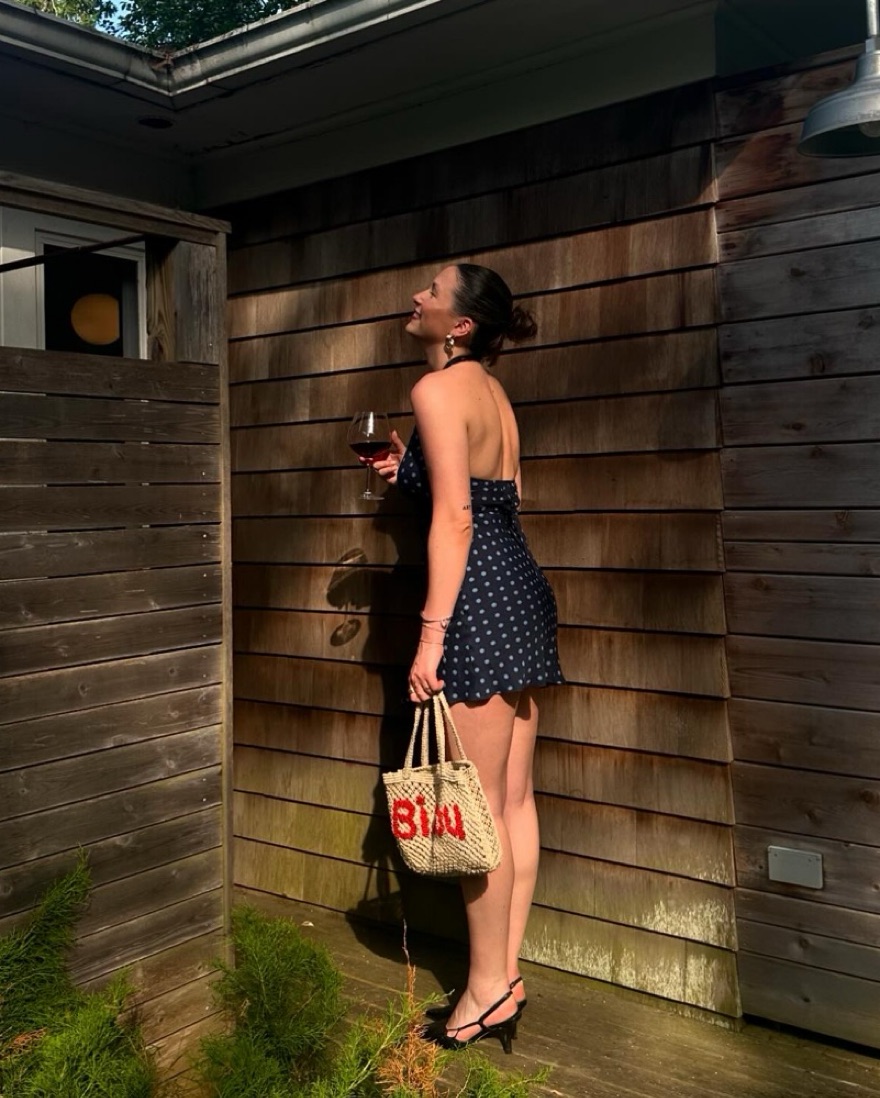 Navy blue, polka dot mini dress with halter neckline.