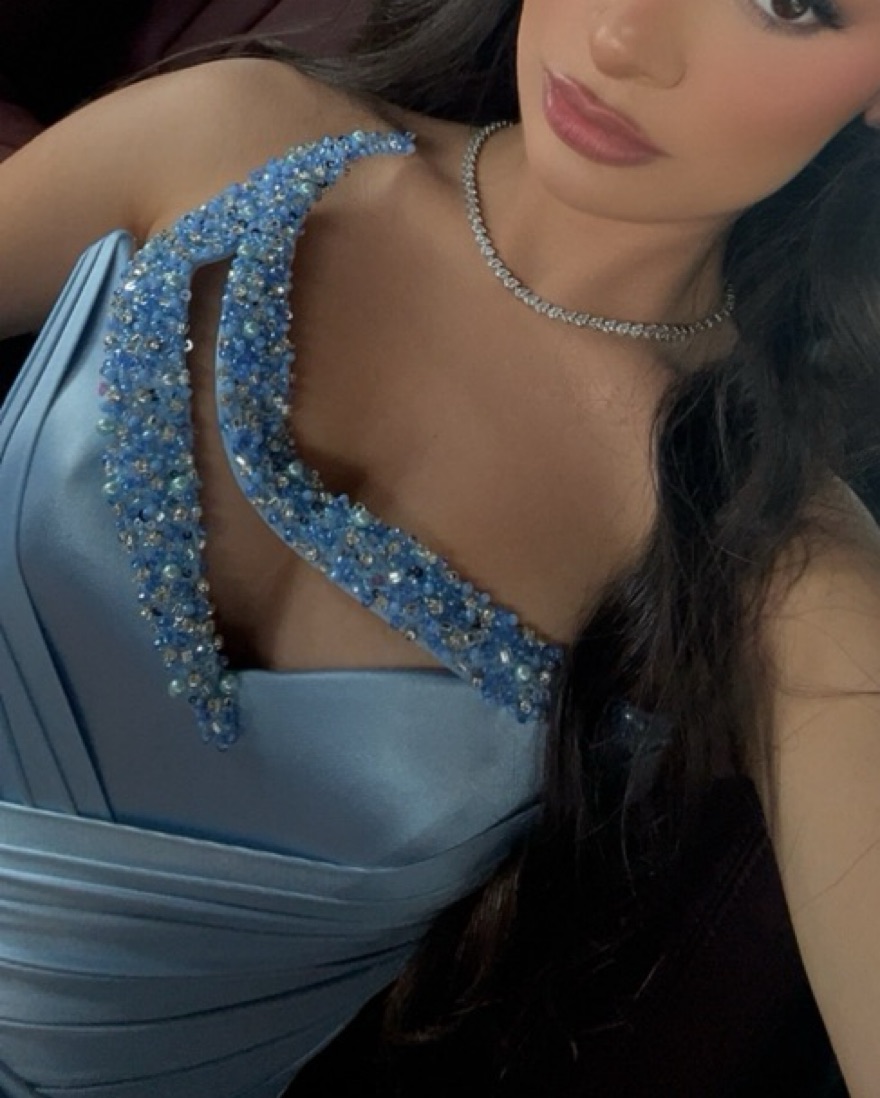 extremely beautiful beaded blue gown with a train. has a high slit. custom added extra beading in the middle. price includes dry cleaning charge. bottom has some marks because people stepped on it at event, but not noticable!