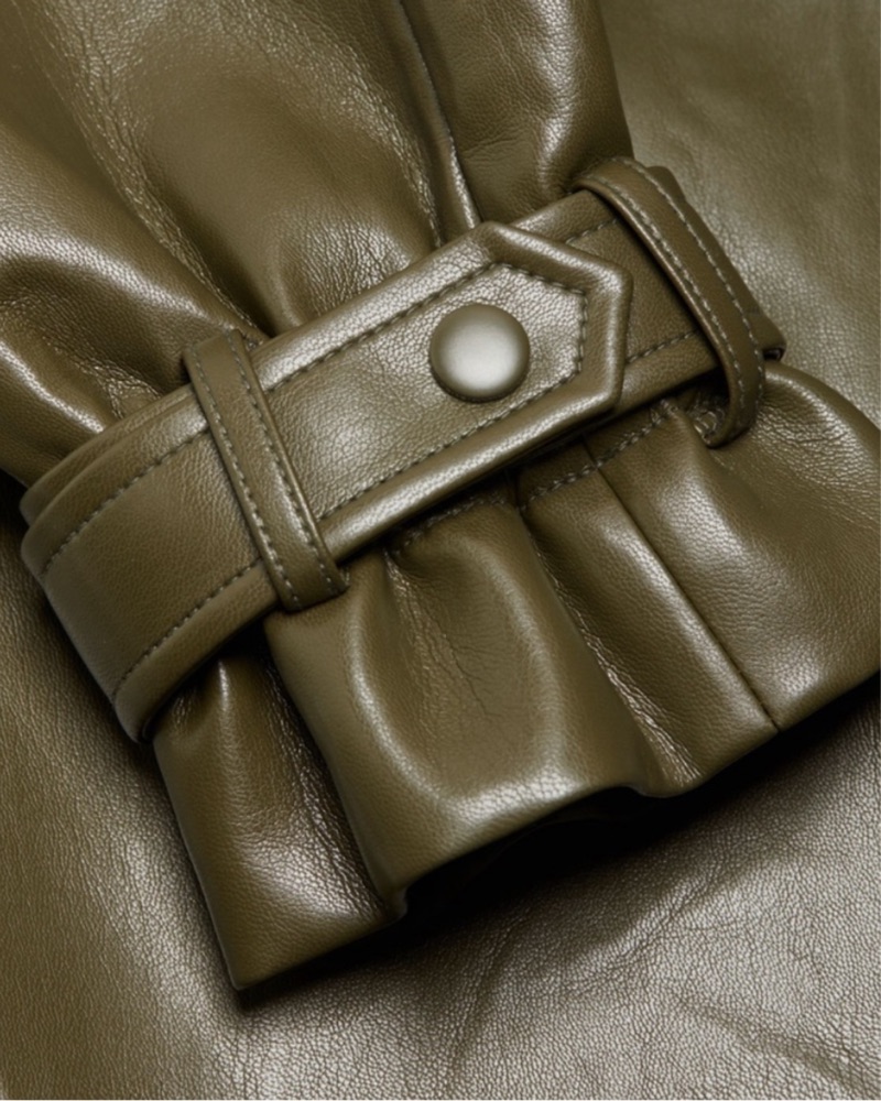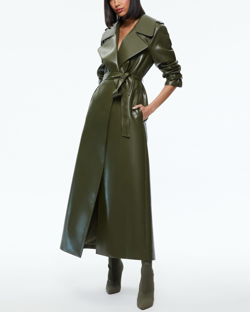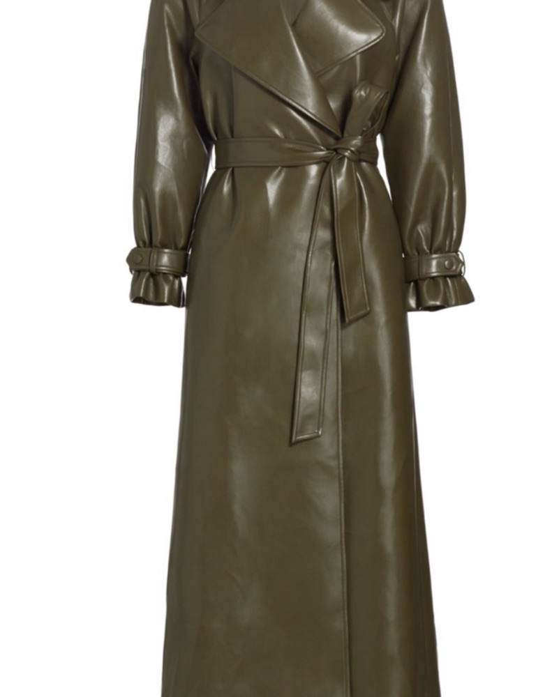 This sleek and stylish olive green trench coat is perfect for adding a touch of effortless sophistication to any outfit. The faux leather material gives it a luxurious look and feel, while the belted waist and flared silhouette create a flattering and feminine shape.