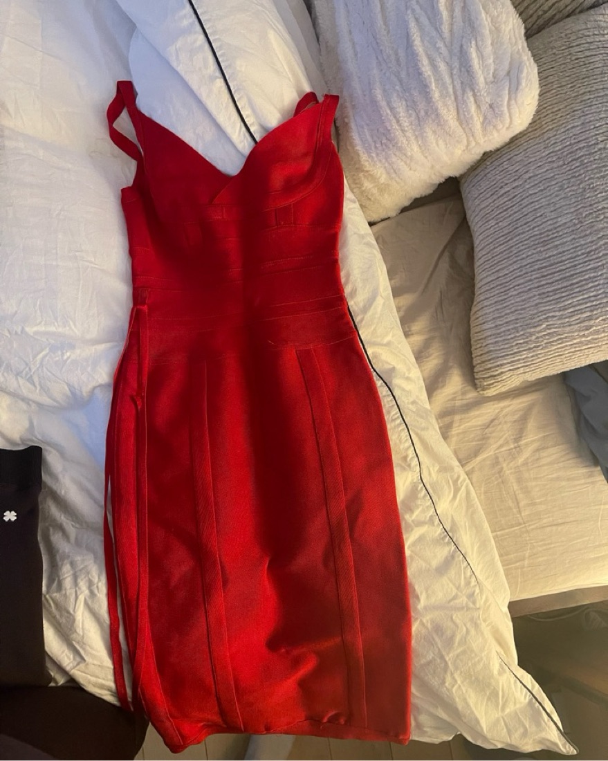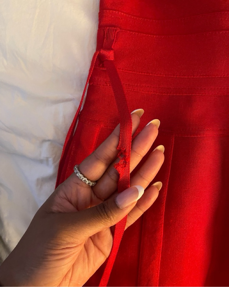 perfect condition except a small tear in the rope but easily hidden when tied. dress snatches you up so well ;)