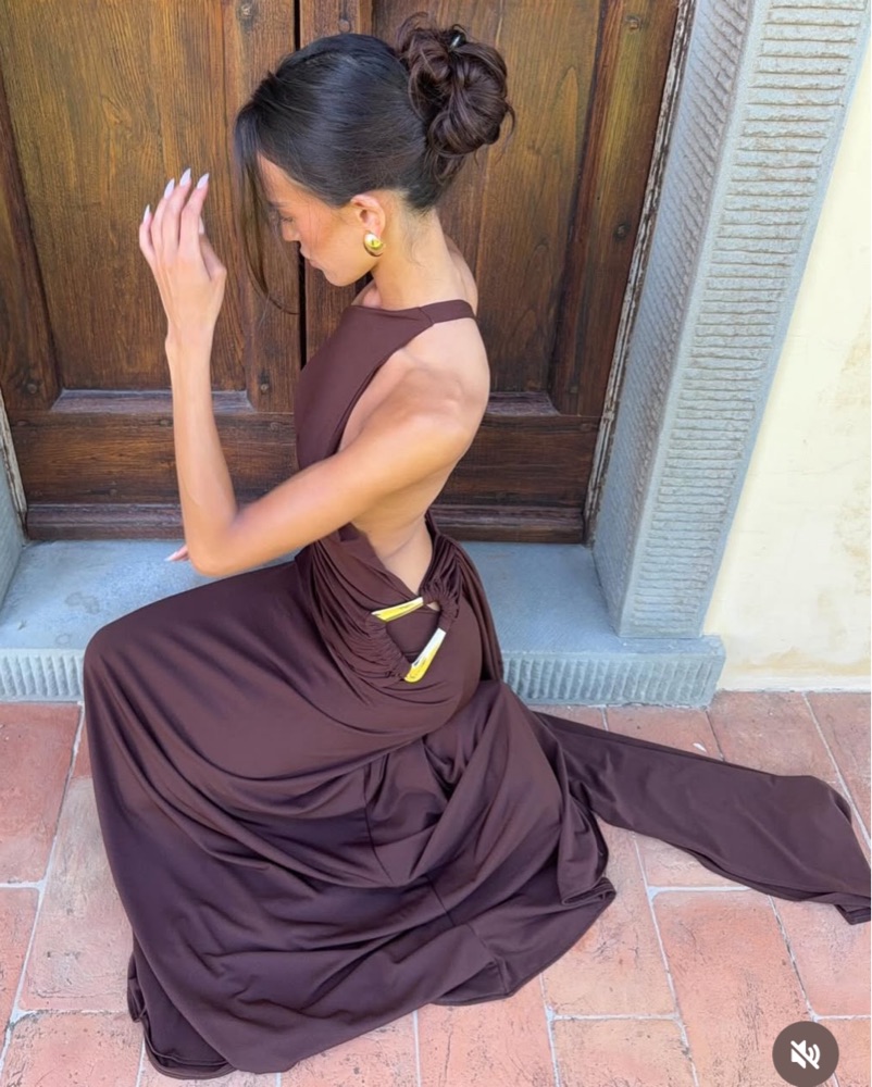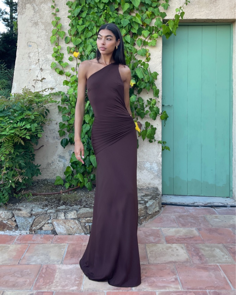 NWT this gown features a one shoulder neckline and open low back. Ruched draped jersey detailing hugs the waist, accentuating your silhouette. Featuring triangular gold hardware that curves around the hip. Material is stretchy and very comfortable.