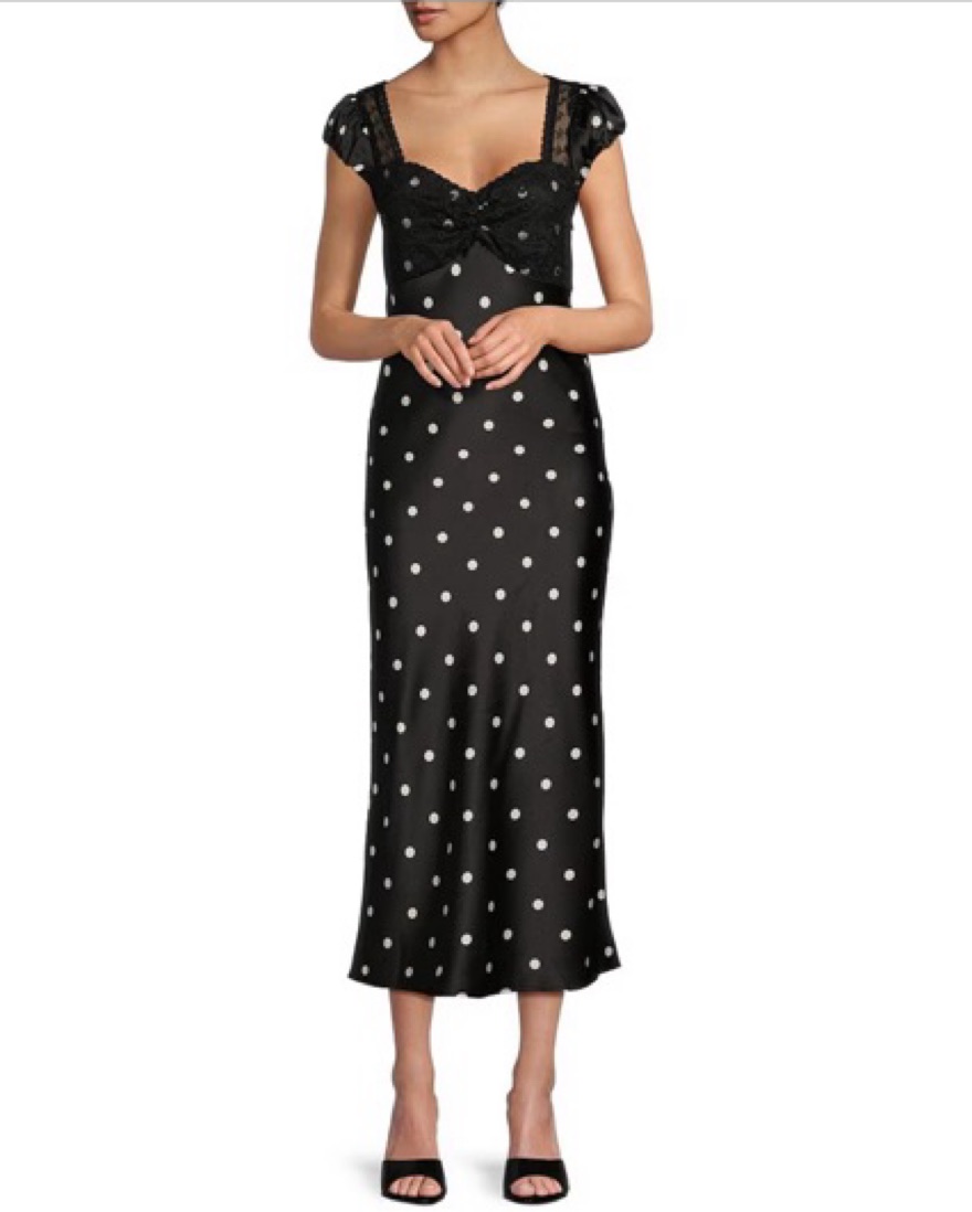All over polka dot satin fabric, Sweetheart neckline, Short cap sleeves with lace, Zipper left side, Approx. 52"